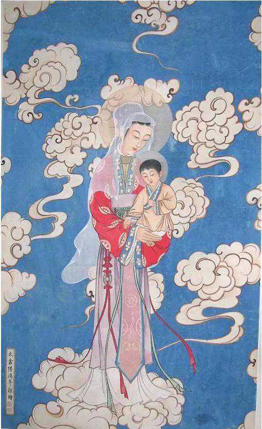 在《辅仁大学师生书画集》中,收录了两幅陆鸿年的作品。其中有一幅反映天主教艺术的画作《提灯盛会》,是一幅以圣母子为题材的工笔兼写意人物画。然而,与西方基督教艺术画作不同的是,在这幅画中,无论是人物还是景物,都充满了中国传统文化的元素。