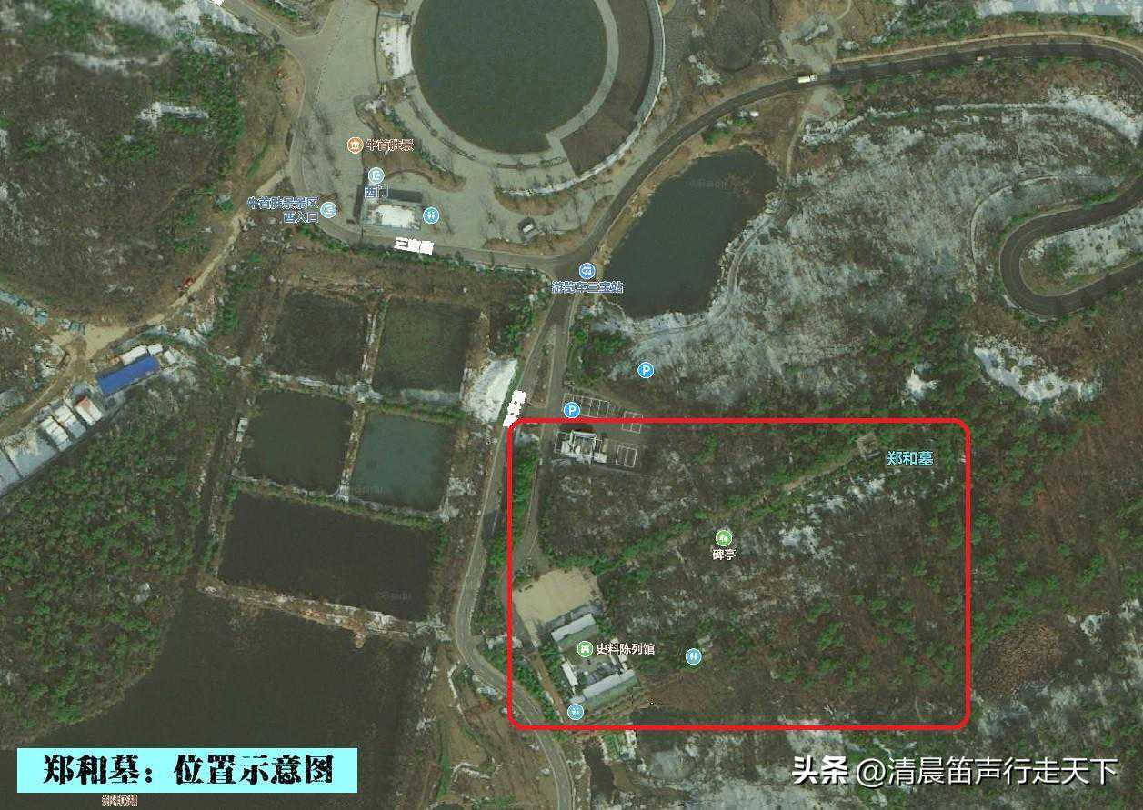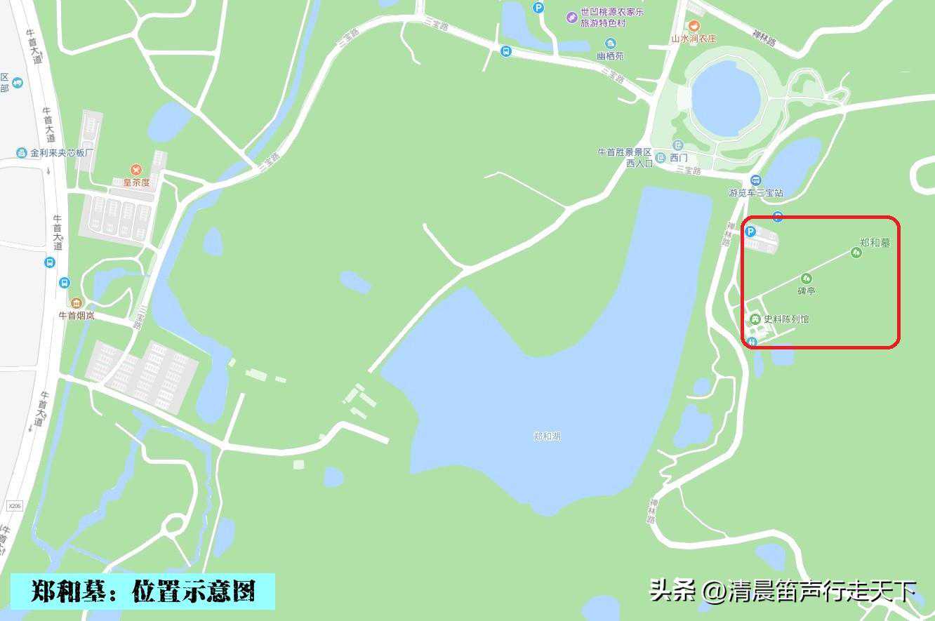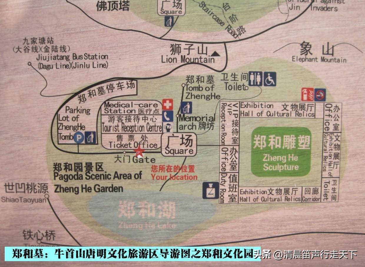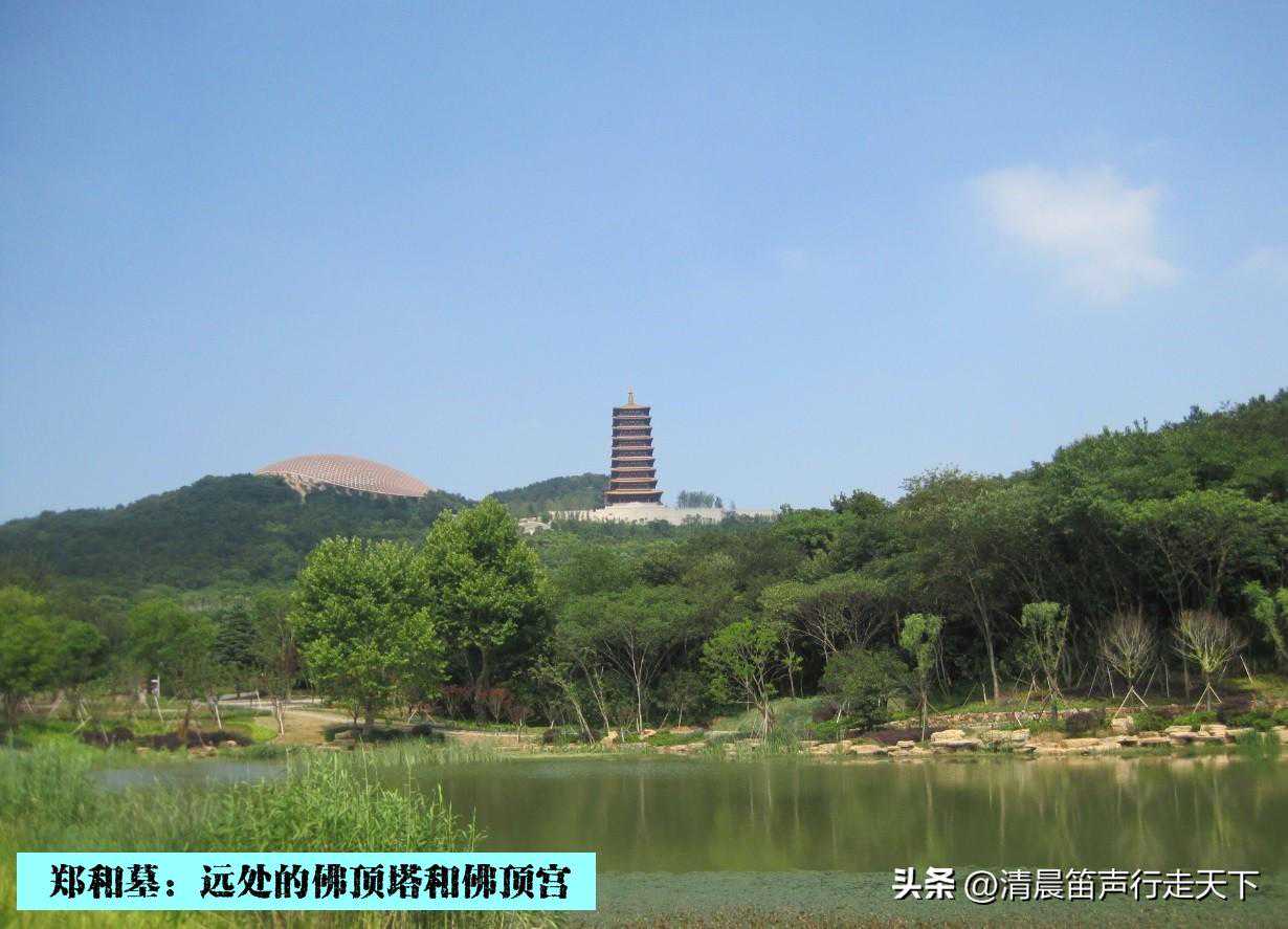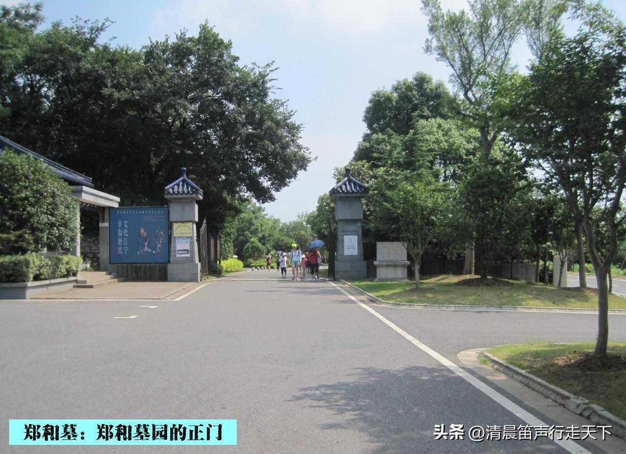 站在三宝路和禅林路的交叉路口,向东望去,可以看见远处山顶的佛顶塔和佛顶宫;向南望去,便是郑和墓园的正门。