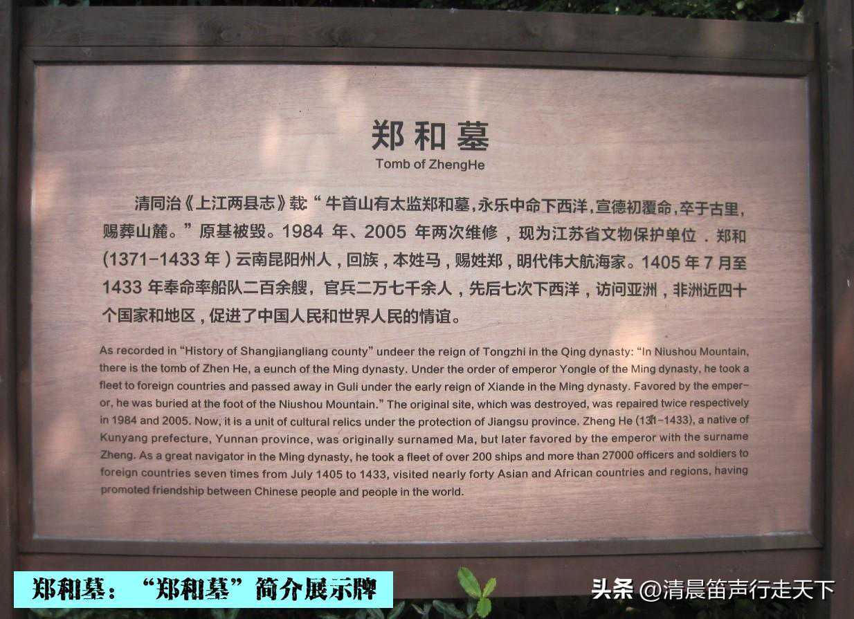 郑和(公元1371-1435年),是我国明代伟大的航海家。永乐三年至宣德八年间,和奉旨率庞大船队七次出使西洋,航海十万余里,历访亚洲三十余国,广结邦交,宣扬文化,促进经济交流,发展航海事业,功绩卓著。郑和本姓马,小名三保,云南昆阳(今晋宁县)人,回族,随燕王朱棣起兵有功,暨燕王称帝,赐姓郑,擢内官监太监。郑和建功于海上二十八年,积劳逝世,葬南京牛首山麓。虽历尽沧桑,墓塚犹存。为纪念郑和之丰功伟绩,以激励炎黄子孙爱国之热忱,致力于振兴中华之大业,值郑和首次下西洋五百八十周年之际,特重修其墓,撰文勒石,以垂永久。