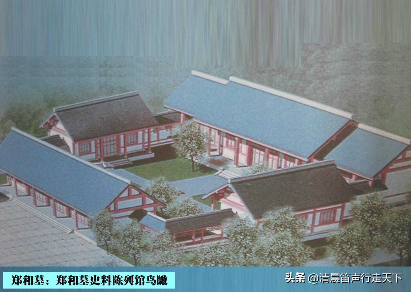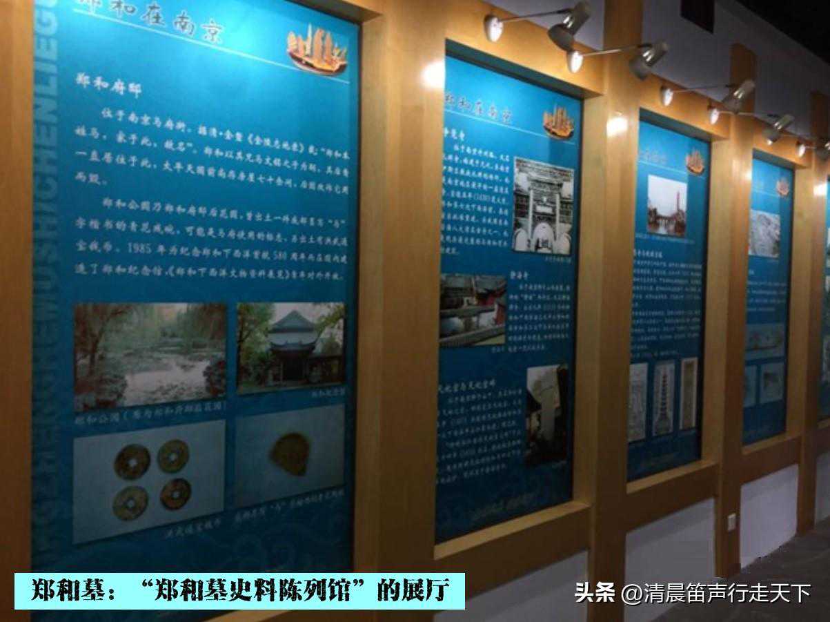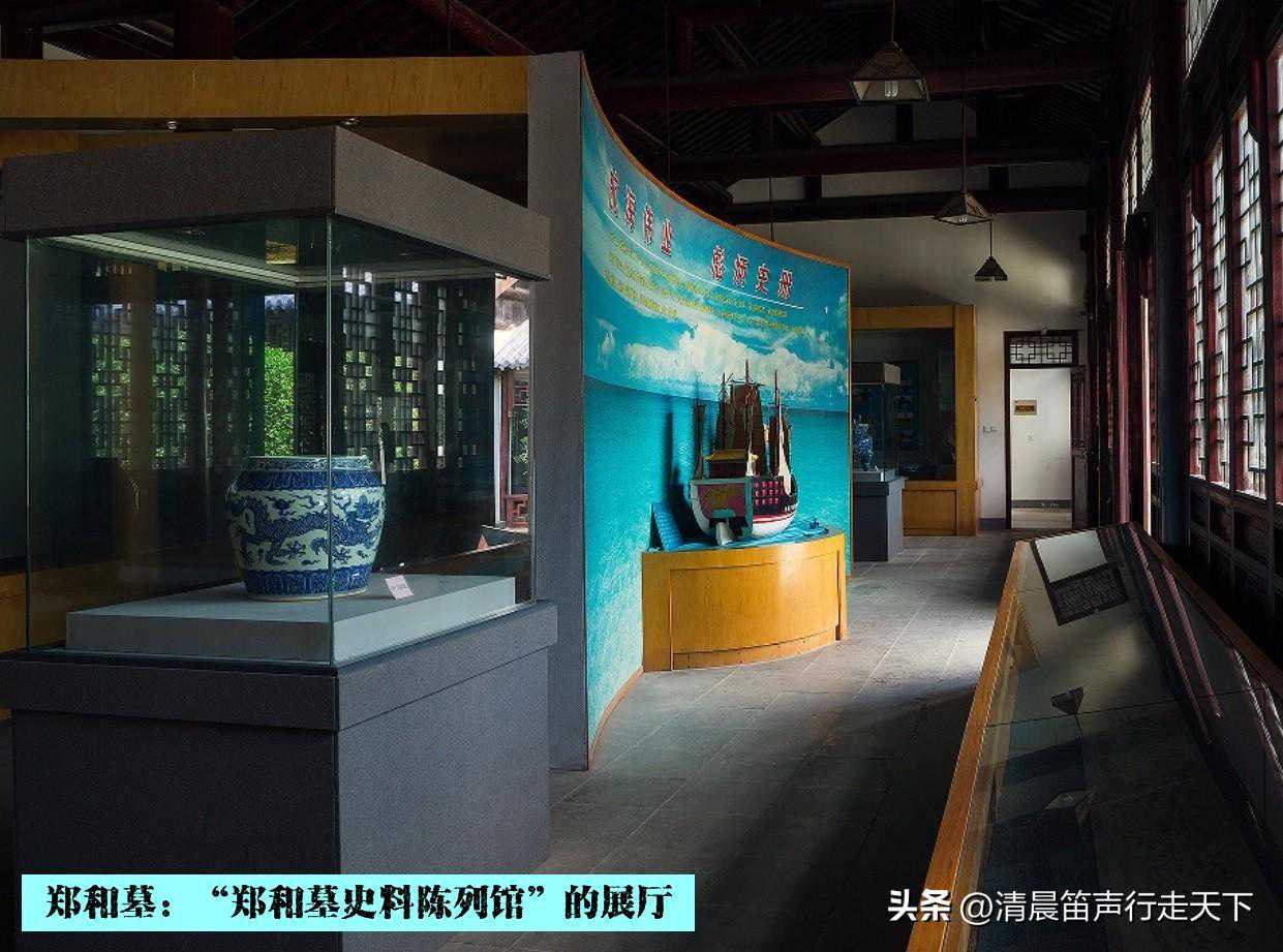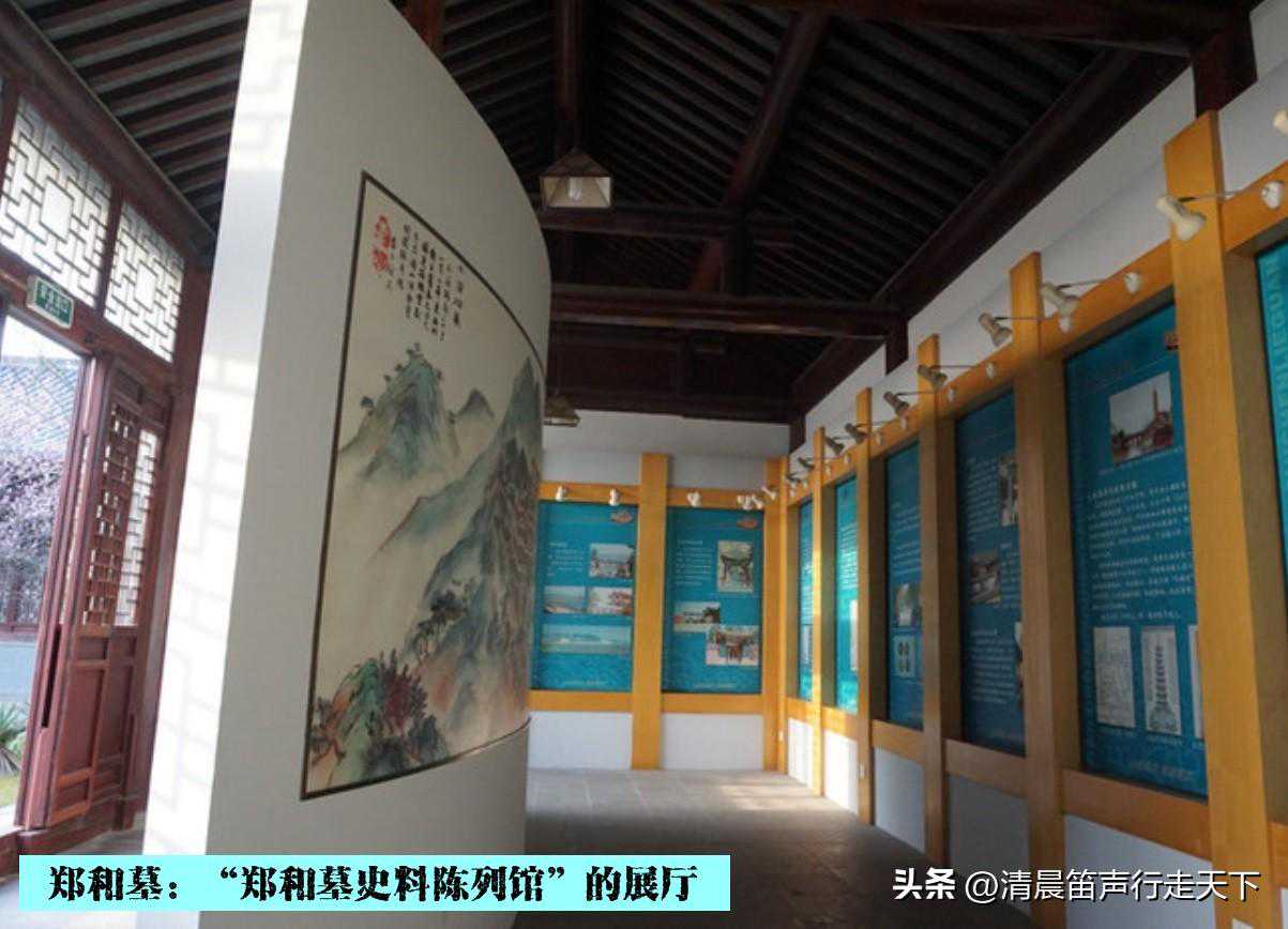 继续前行,是一个空旷的广场,在广场的南端,一幢仿明式建筑,是“郑和墓史料陈列馆”。陈列馆两侧的廊柱上有一副对联,“劈波斩浪三十载谱写航海千秋史,披肝沥胆半生愿缔结邦交万国春”,为陶敬儒先生题写。