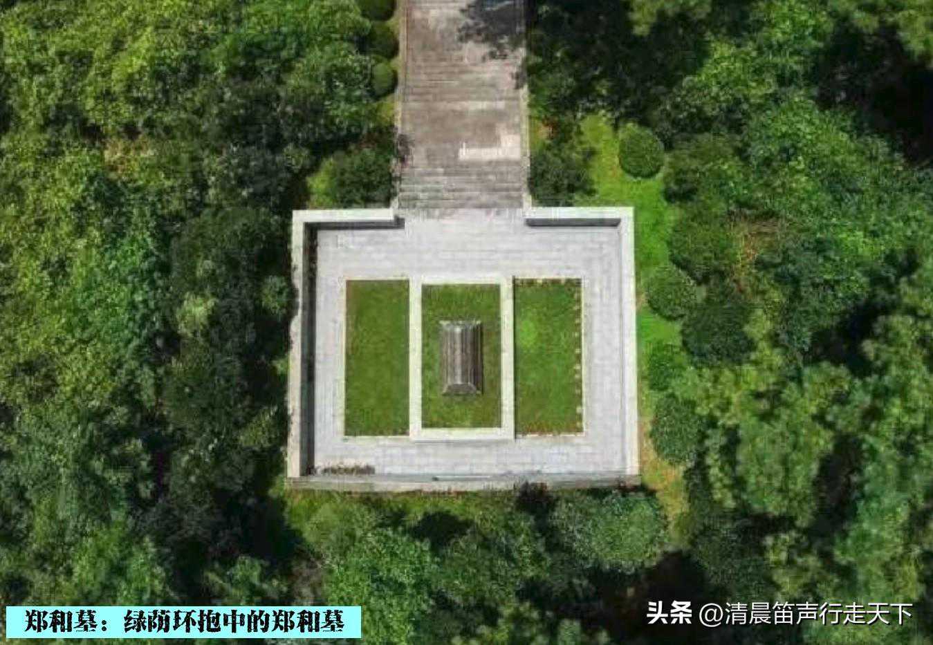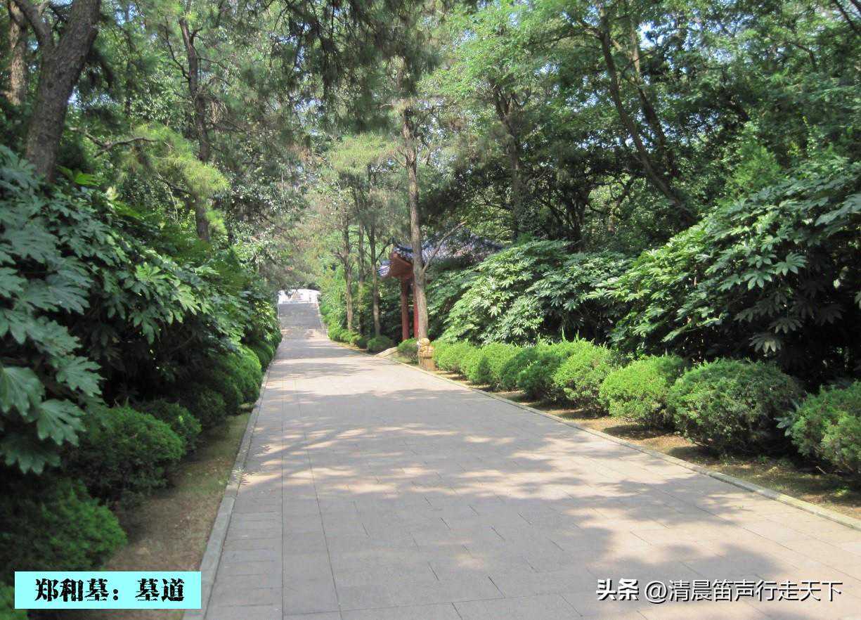 广场向东,是通往郑和墓的墓道。墓道两侧列植松柏,郁郁葱葱,墓道的长度大约一百来米,据说是1405米,象征着郑和1405年首航出发下西洋。