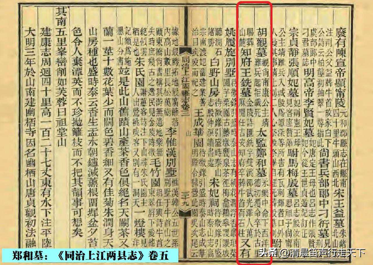 清代《同治上江两县志》卷三中记载,“太监郑和墓(永乐中命下西洋,宣德初覆命,卒于古里,赐葬山麓。”