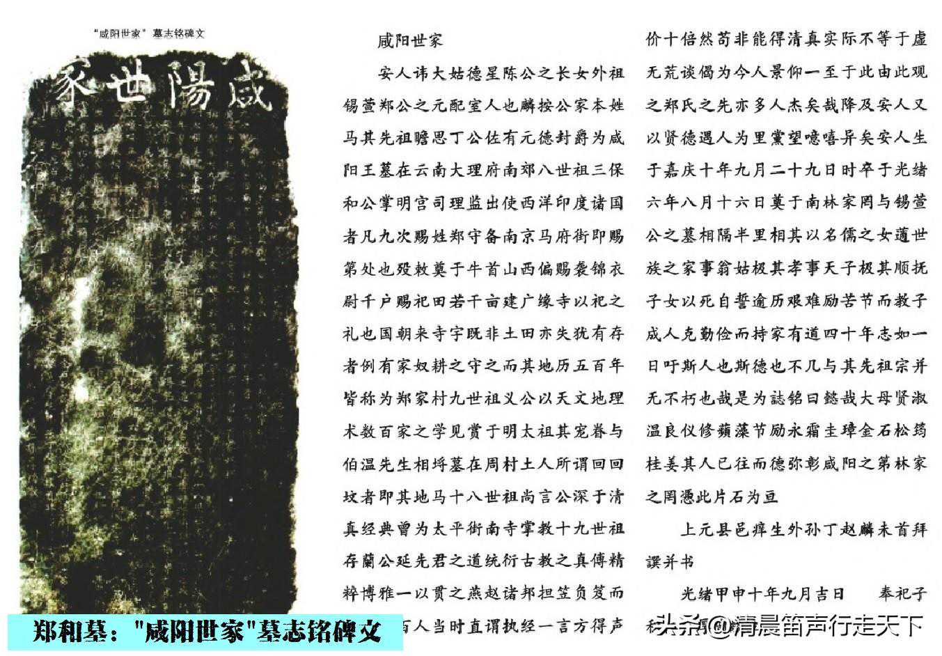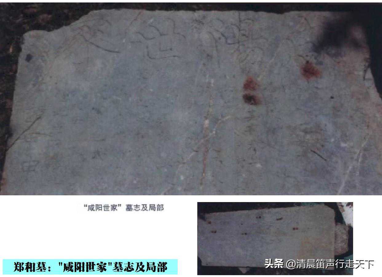 此方“咸阳世家”墓志,是光绪甲申年间其外孙上元县书生丁赵麟书写、墓主人其(子)二十二世孙郑积仁和其(孙)二十三世孙郑厚陶1884年所立祭祀碑文。碑文对郑和出生、赐姓、赐府、赐葬牛首山、赐祀田以及管理祀田人的身份、奉命下西洋次数、郑和后裔的辈分等内容进行了较为全面的记载(其中云,“……八世祖三保和公,掌明宫司理监,出使西洋印度诸国者,凡九次。赐姓郑,守备南京,马府街即赐第处也。殁,敕奠于牛首山西偏。赐袭锦衣尉千户,赐祀田若干亩,建广缘寺以祀之礼也……”等)。