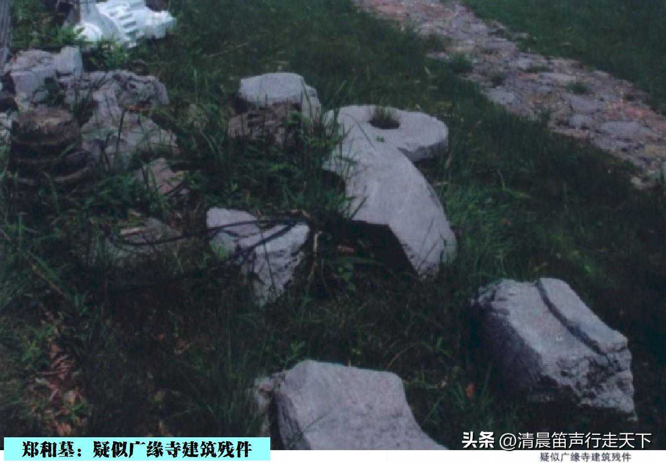 至于碑文中提及的“广缘寺”遗址在何处,经郑和墓园文物保护管理所调查,广缘寺位于郑和墓西侧郑和湖水库附近,并在郑和湖周边发现了大量建筑基座和残破的柱础石、石望柱、石砖雕、城墙砖、陶瓷器残片等。