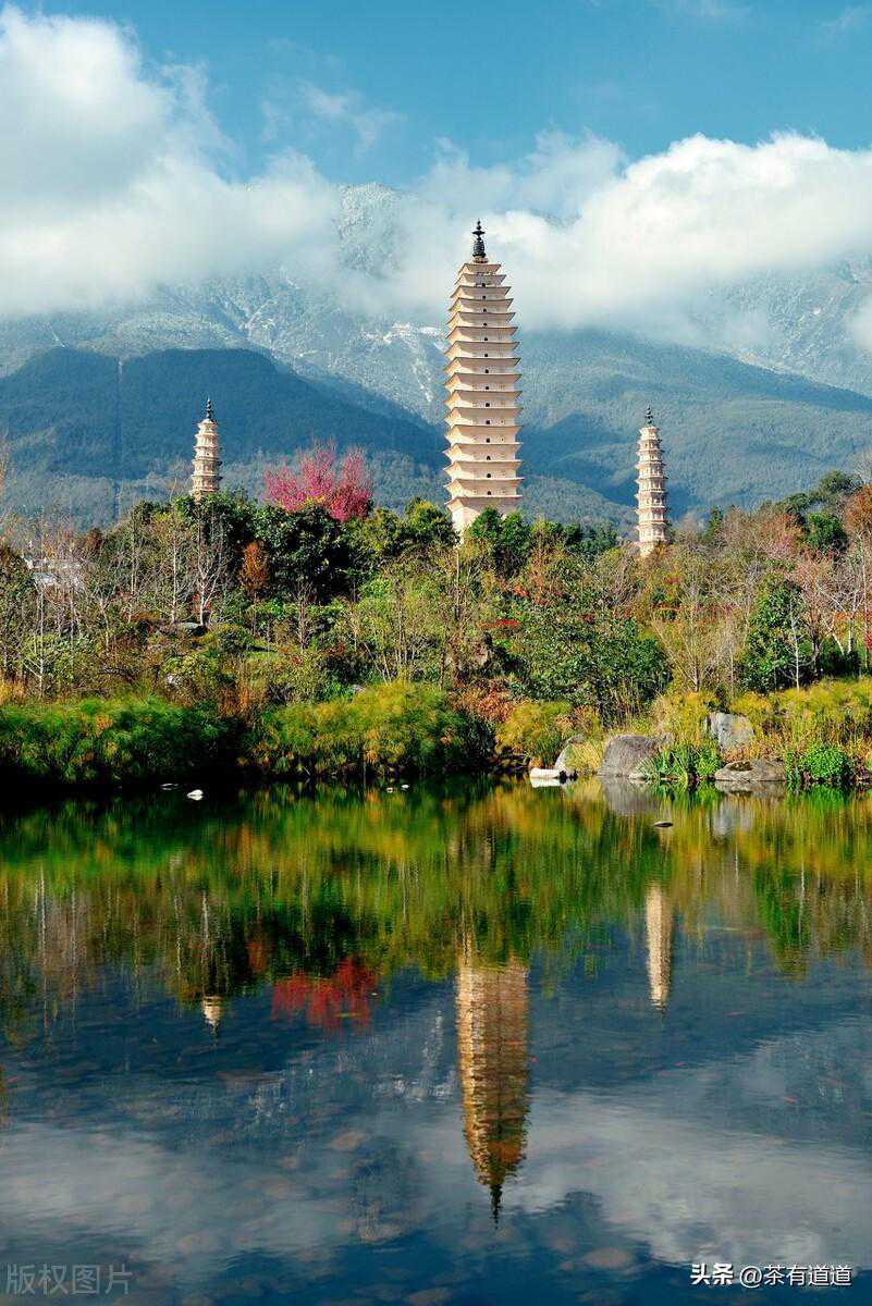 雨后苍山脚下大理云雾缭绕大理地标建筑崇圣寺三塔和倒影