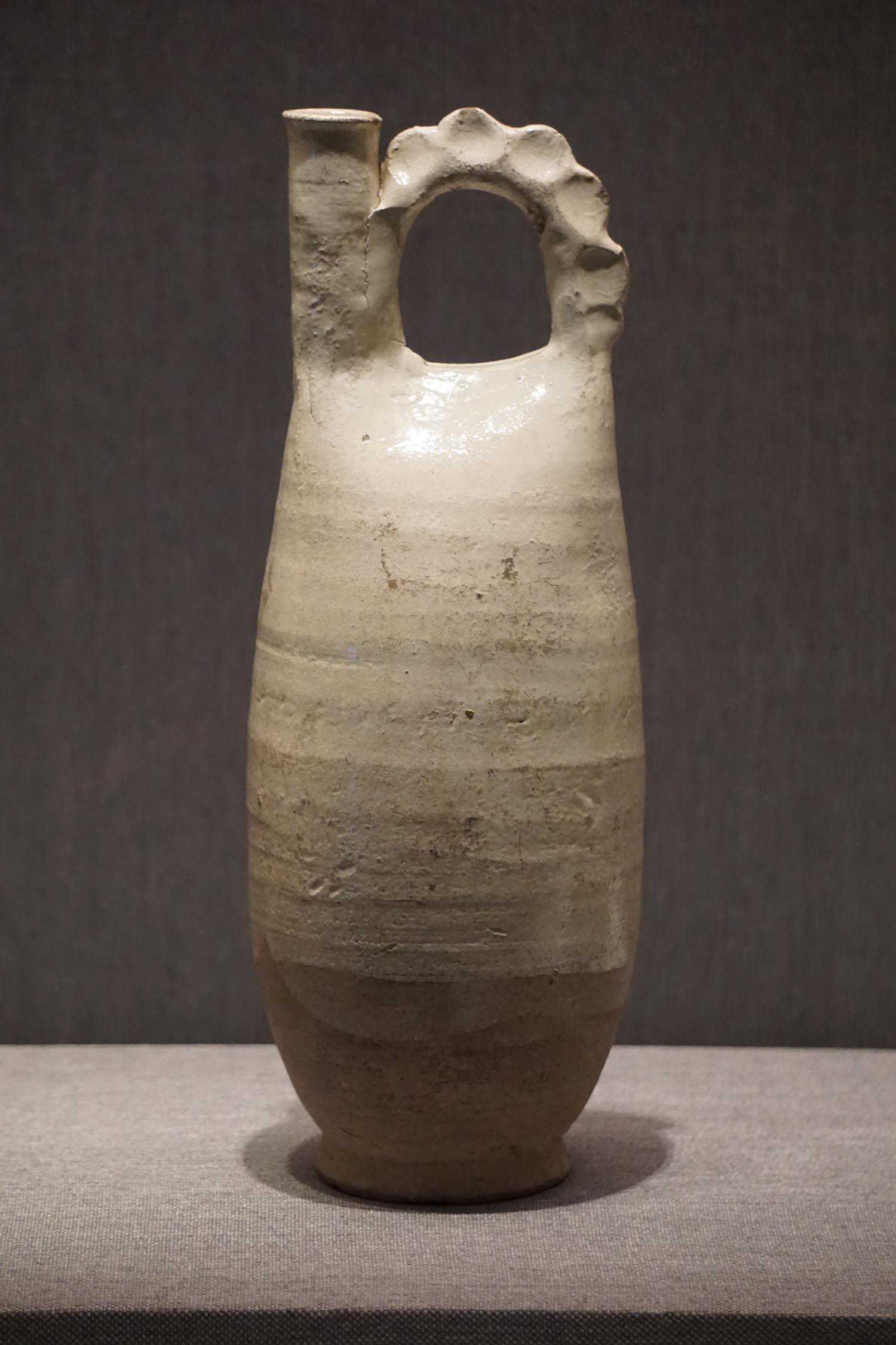 白釉绿彩皮扣装饰单孔鸡冠壶辽