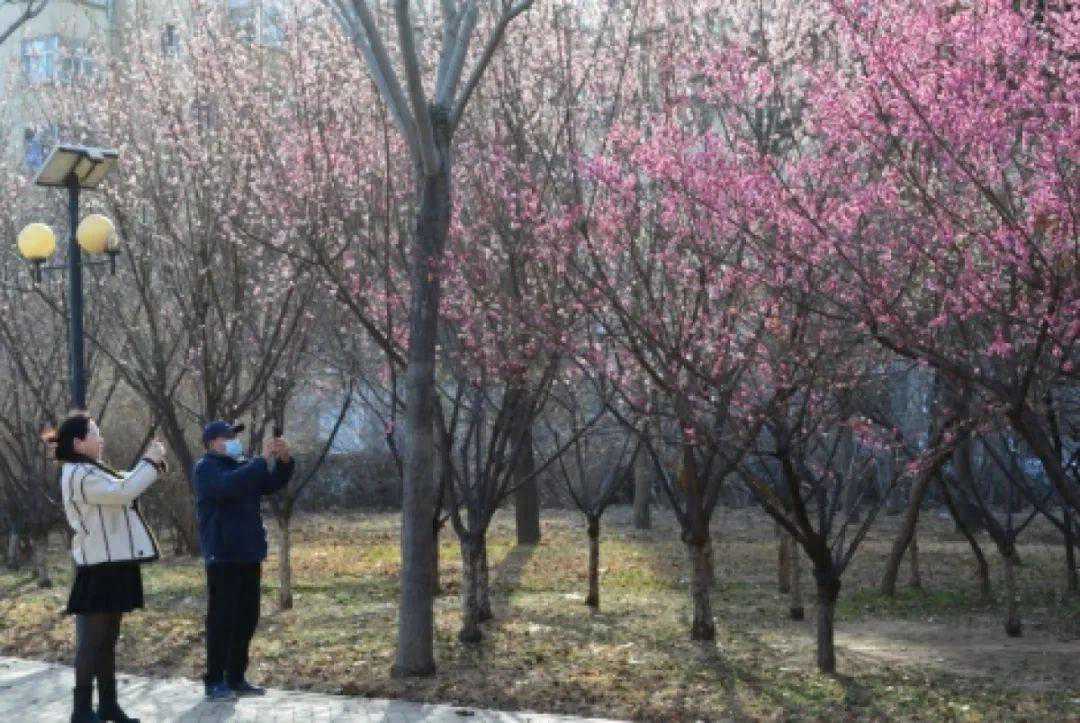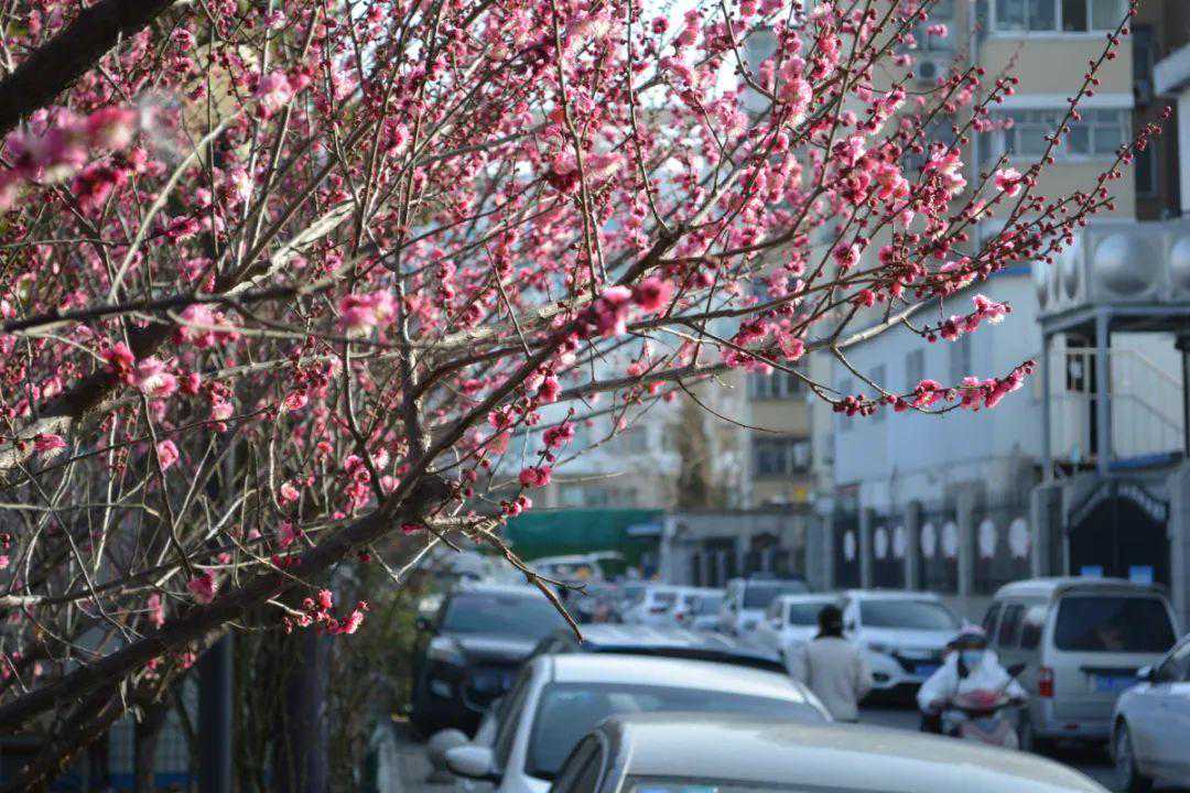 金水公园里、街头的梅花争相绽放