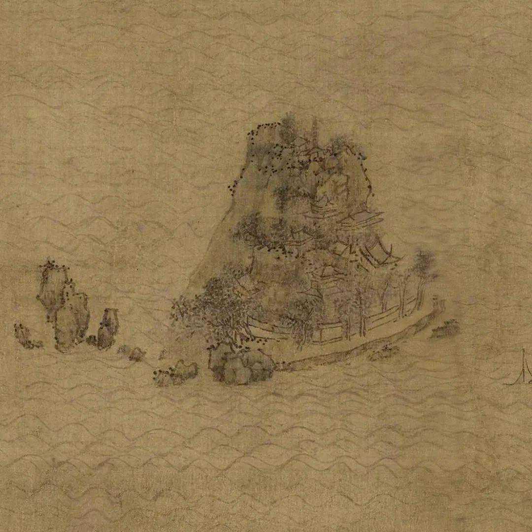 他将地平线推往画卷的顶端,以拖迆的岸际展现水面的宽度;又巧妙地稍稍压低金山,使两座几乎对称的岛屿区分出层次;再通过缩减物象的比例,使画面的空间得到极大延展。