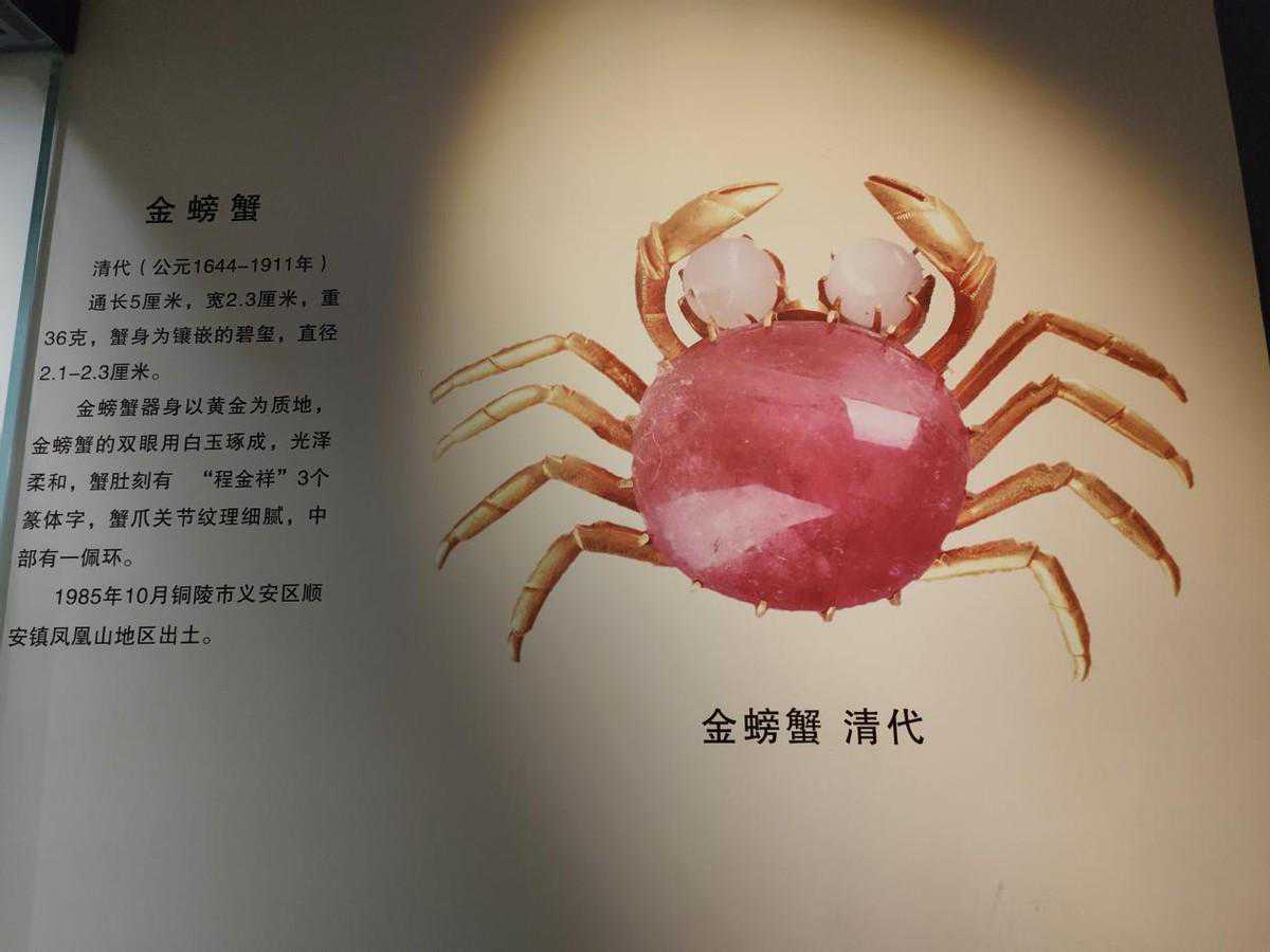 在古铜色下,我反而先看金螃蟹;蟹身是黄金,双眼是白玉,蟹爪的细节栩栩如生。年代并不遥远,是清代的精品,1985年在顺安镇凤凰山出土,但工艺的精心非凡脱俗,我很是喜欢。