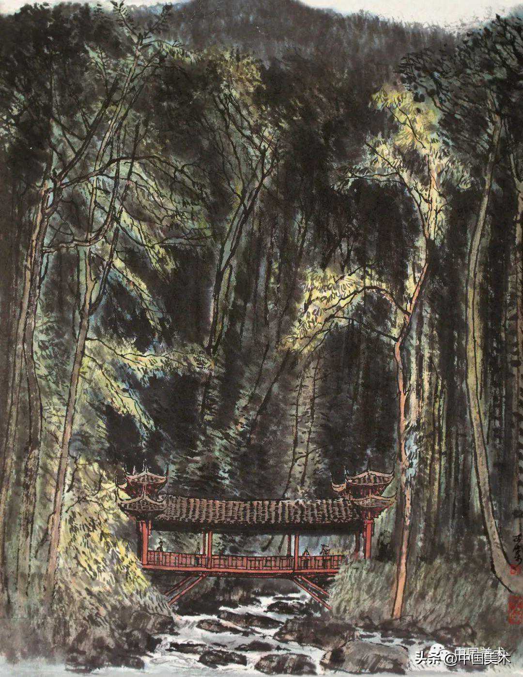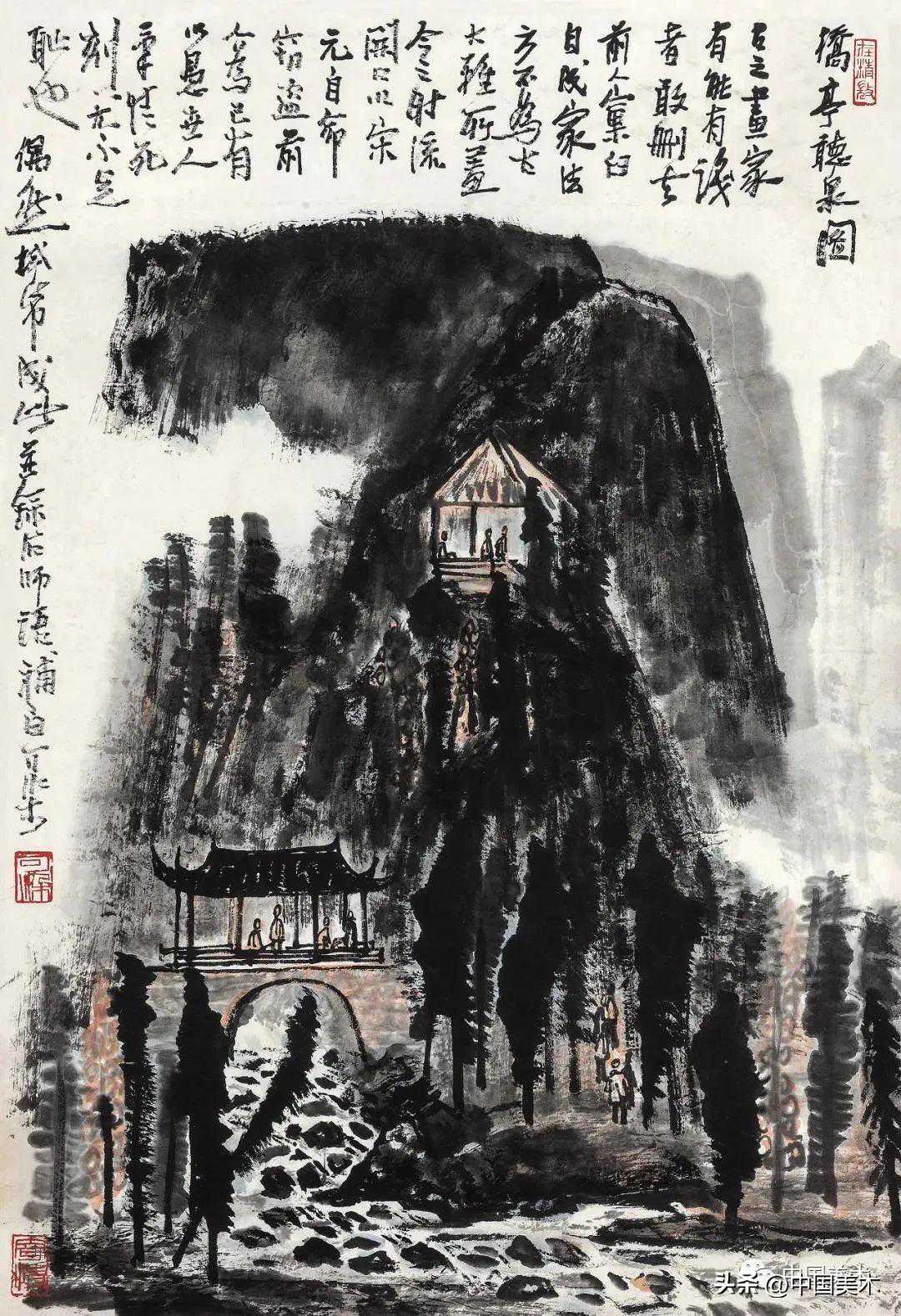 李可染桥亭听泉图