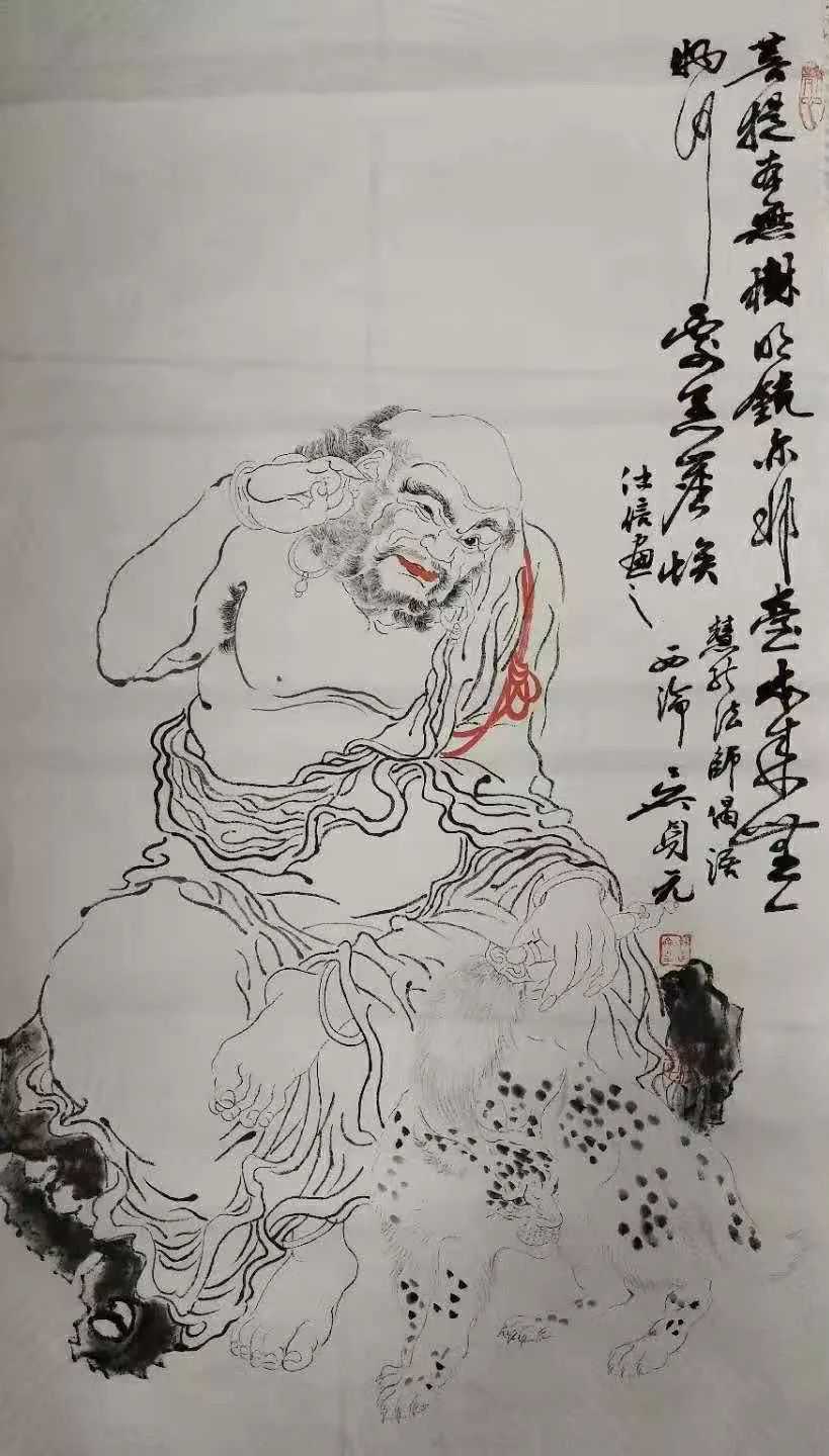 天有不测之风云,人有瞬间之困厄。但是,在万能观世音面前,只要抛却妄念,心存敬畏,则有求必应,有结必解,有善必报。作者虽非僧家居士,却深谙“佛法慈悲”之道。于是通过娴熟的人物勾勒之手法和线条,将地位悬殊的人间之求和佛法之助两种截然相反的境界融合成慈母与赤子般的骨肉亲情关系,一个是慈眉善目,一个是诚心诚意,观之唯有少长之分,而没有尊卑之别。若非对佛教普度众生之理念有醍醐灌顶之彻悟,则断然没有如此炉火纯青之艺术表现功夫。
