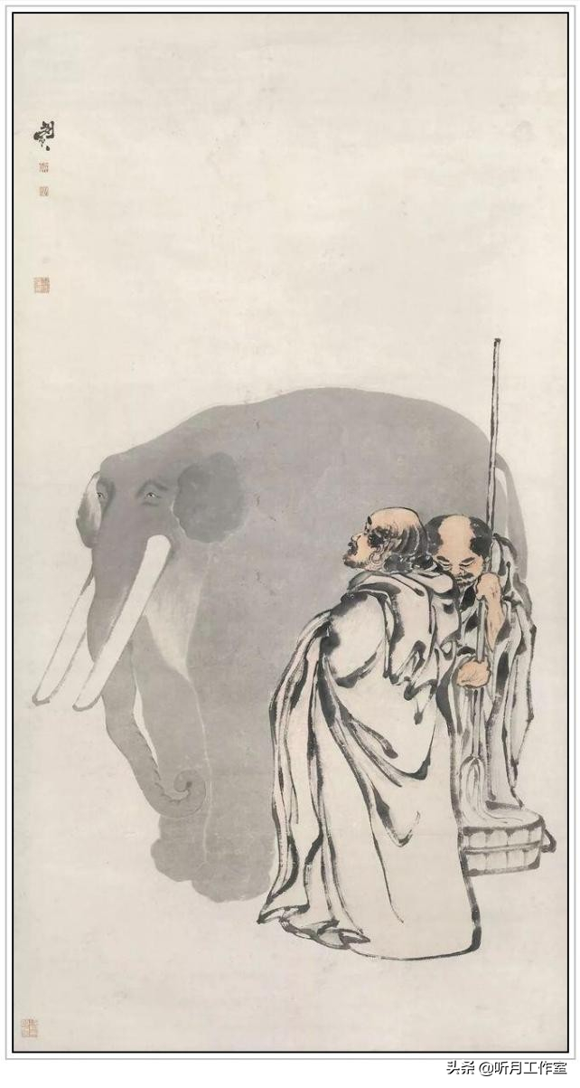 闵贞《洗象图》轴,纸本设色纵224cm横120cm德基美术馆。