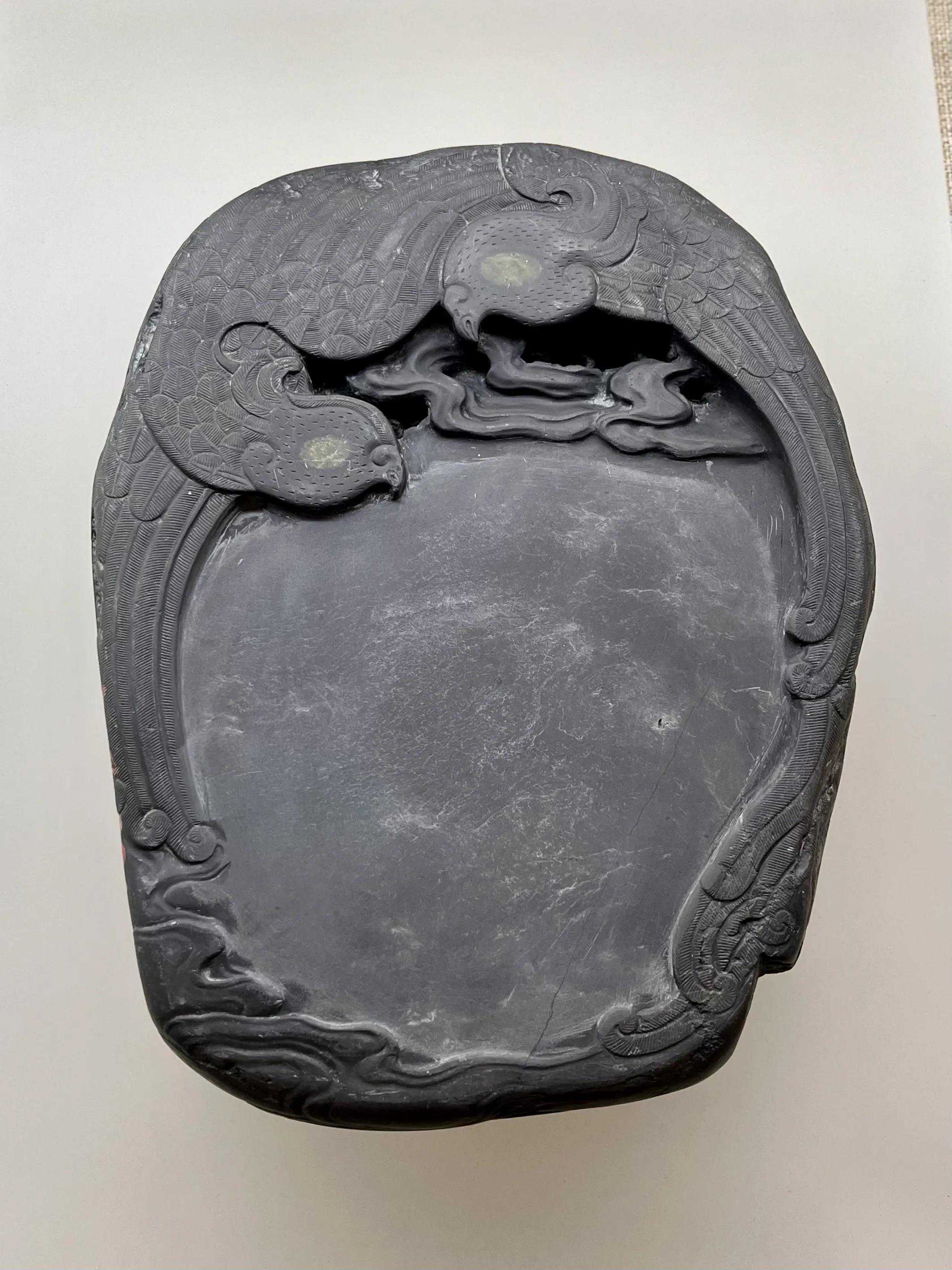 坑仔岩石。鸾鸟口衔仙桃的图案,被称作“青鸾献寿为传统砚式。