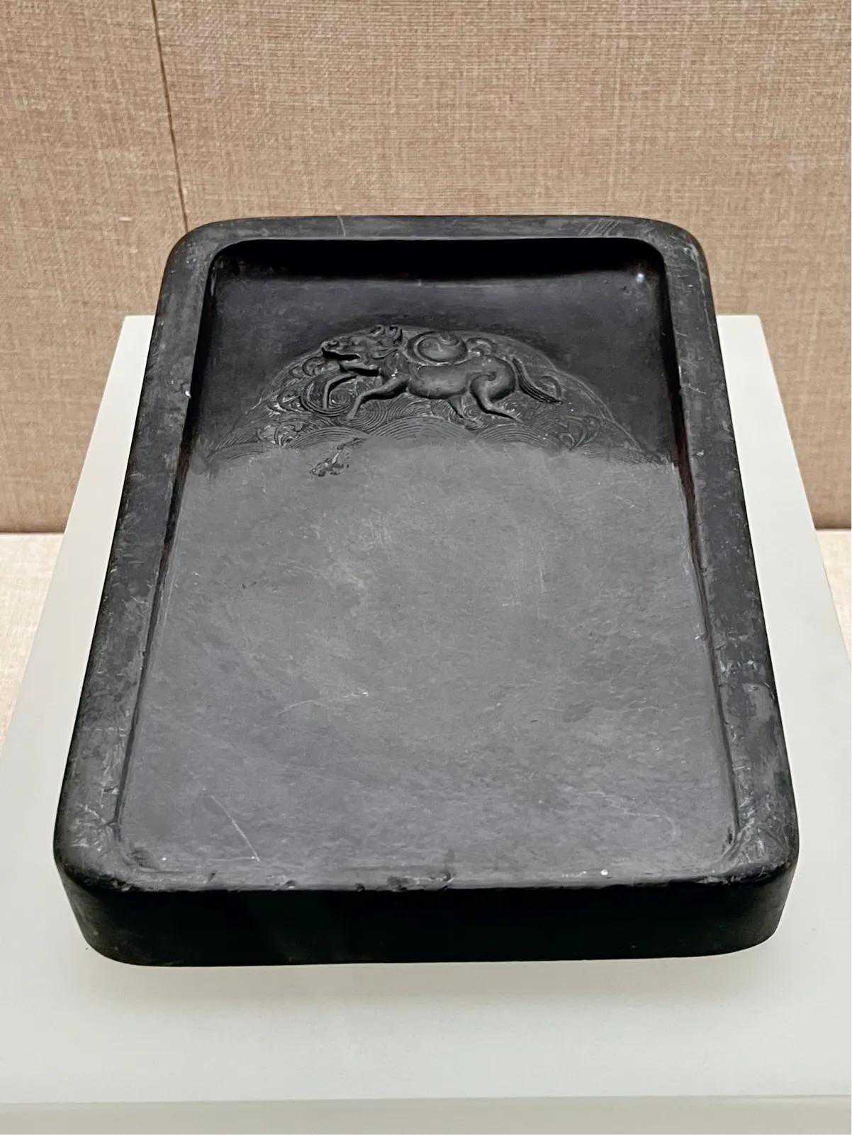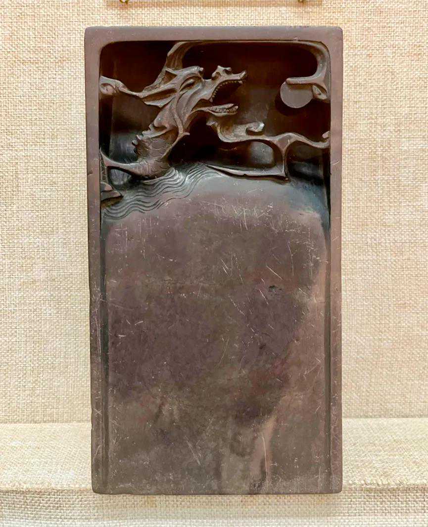 砚池雕刻“龙马负图”图案。传说上古时期,黄河中浮出龙马,背负“河图”,献给伏羲,伏羲依此演变出八卦。“龙马负图”图案虽简单,却蕴藏了深厚的文化内涵。