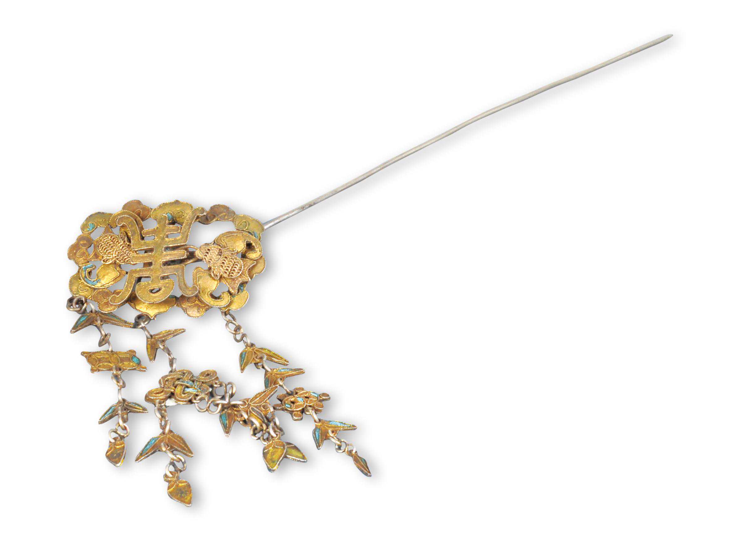 长18、宽9.5厘米。头饰为银镀金,其主体是一长寿字,左右各有一蝙蝠,配如意云头纹边。