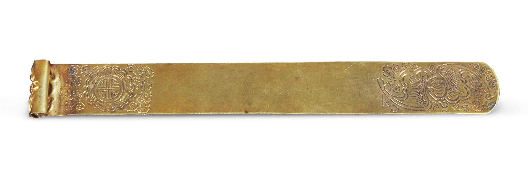 长15.1、宽1.9、厚0.1厘米。扁方材质为黄金,尾端呈半圆舌形,首端反卷成空柱状。紧靠扁方头部有一錾刻宝相花,花心为錾刻团寿字,花四周衬以点状线构成的如意云纹;靠近尾端处,有一线刻飞翔的蝙蝠,四周衬以点状线组成的如意云纹,图案整体纹饰寓意“福寿如意”。