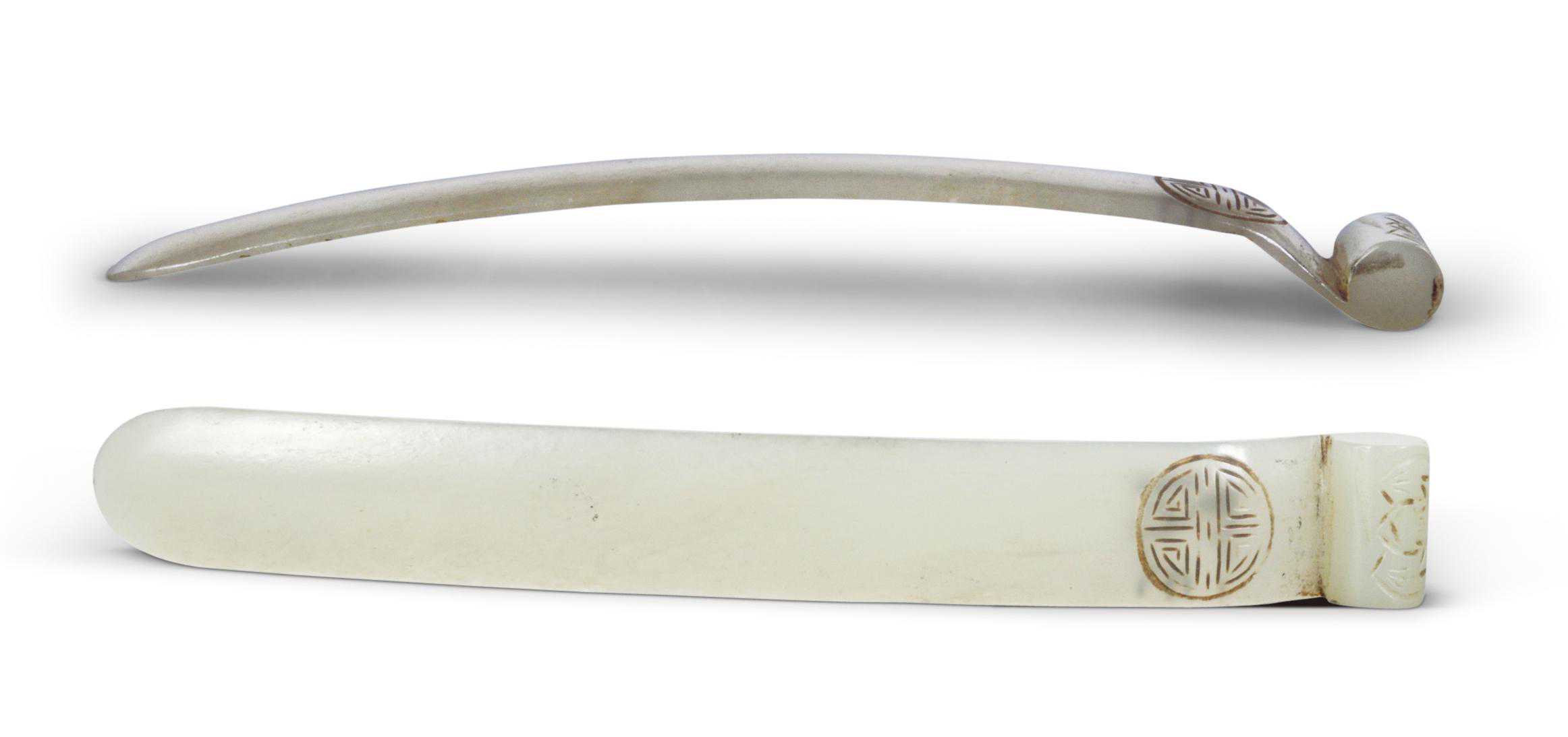 左右钩首玉板,两件,长6.4、宽4.3、厚2.2厘米。白玉,以龙头为钩首,纹饰为福寿双全。