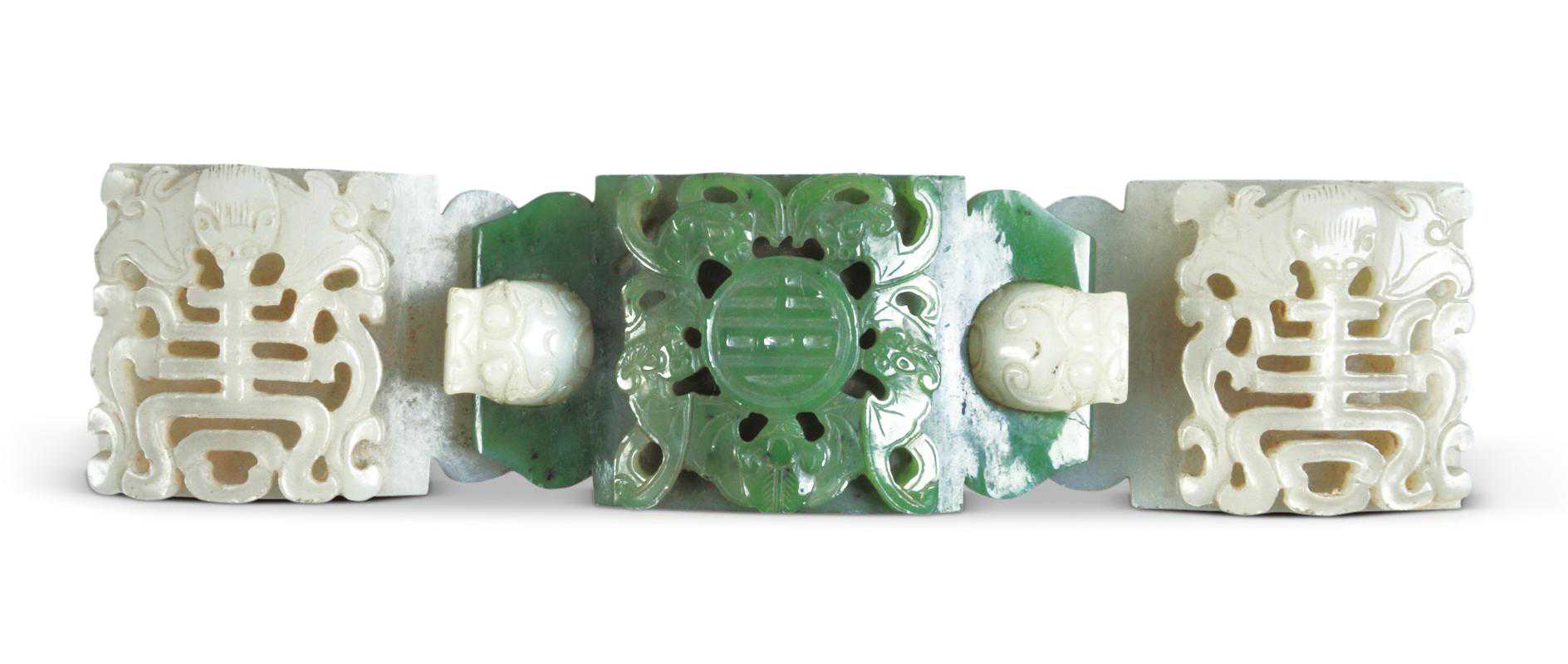中间扣环玉板,一件,长8、宽4.3、厚1.8厘米。碧玉质,左右各有一扣环,纹饰为五福捧寿图案。