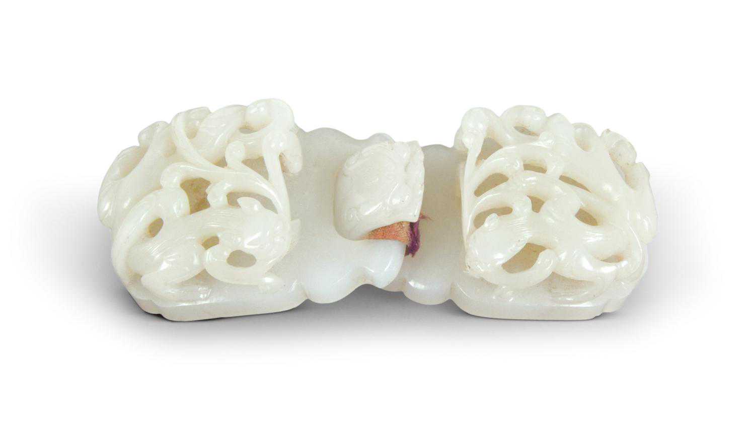 钩首玉板长6.1、宽4厘米,扣环玉板长5.8、宽4厘米。白玉雕制,两件相扣,一件端头为钩首,另一件端头为扣环。两件白玉件上均透雕蟠螭一条,两件玉板上纹饰图案成对称图案。蟠螭口衔灵芝,身盘尾卷,寓意“吉祥长寿”。