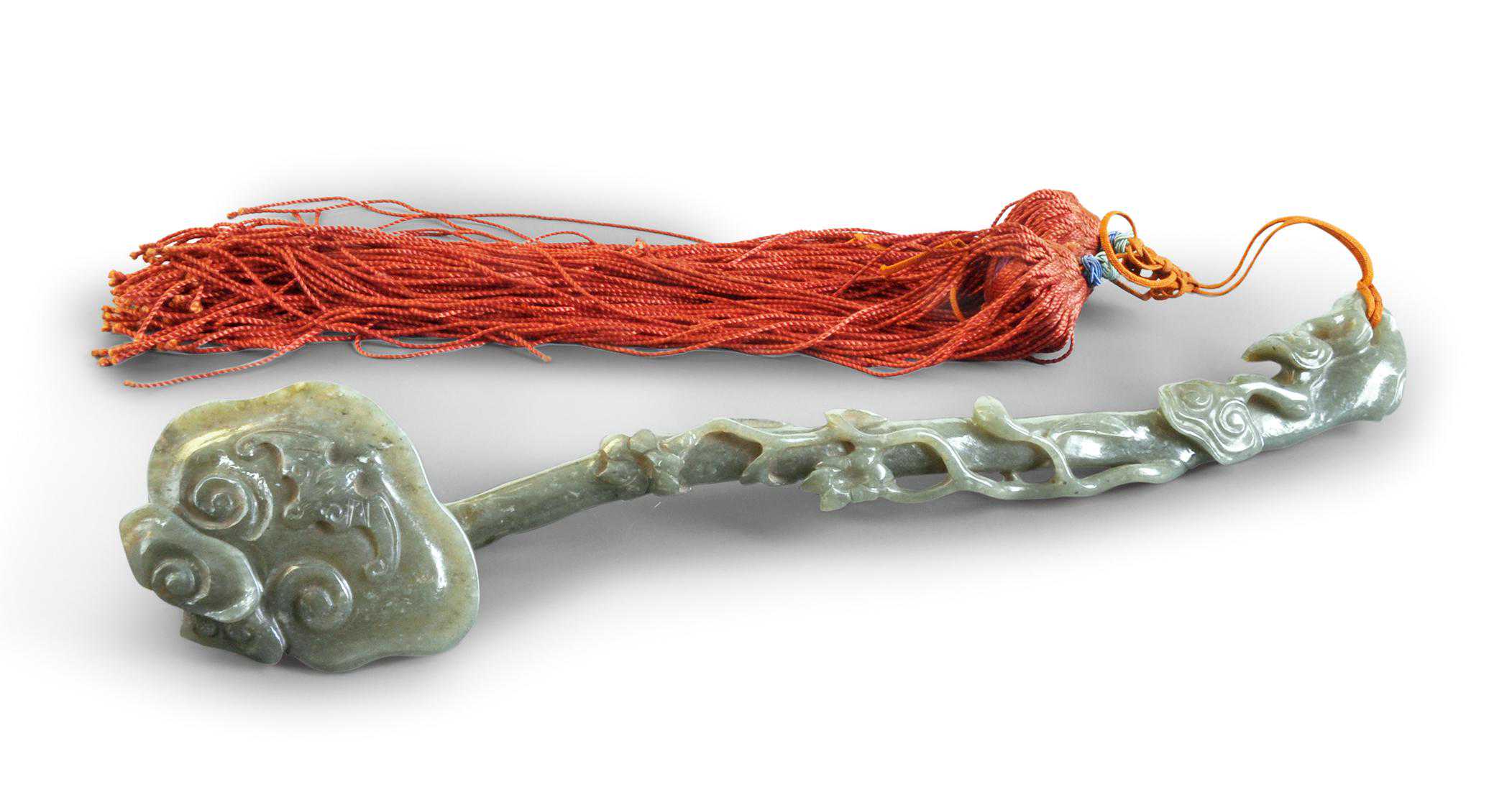 长31厘米。如意以整块碧玉雕琢而成,通体碧绿,灵芝式,如意头浮雕大小三朵灵芝和一只蝙蝠,寓意“称心如意”“福寿双全”。柄身镂雕花朵和枝叶,枝叶顺柄生长,尾部雕有两三朵小灵芝。柄端穿孔,系红色穗。