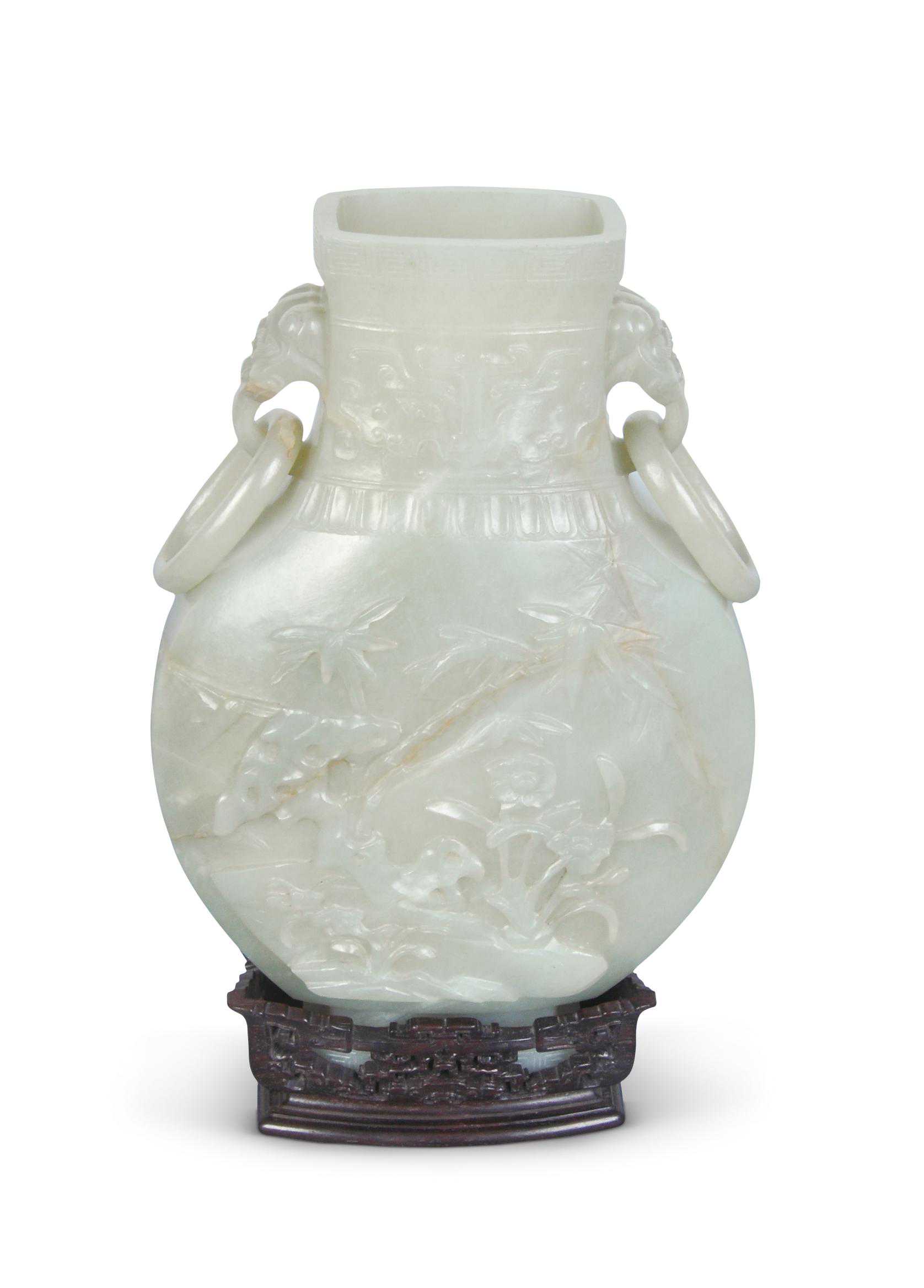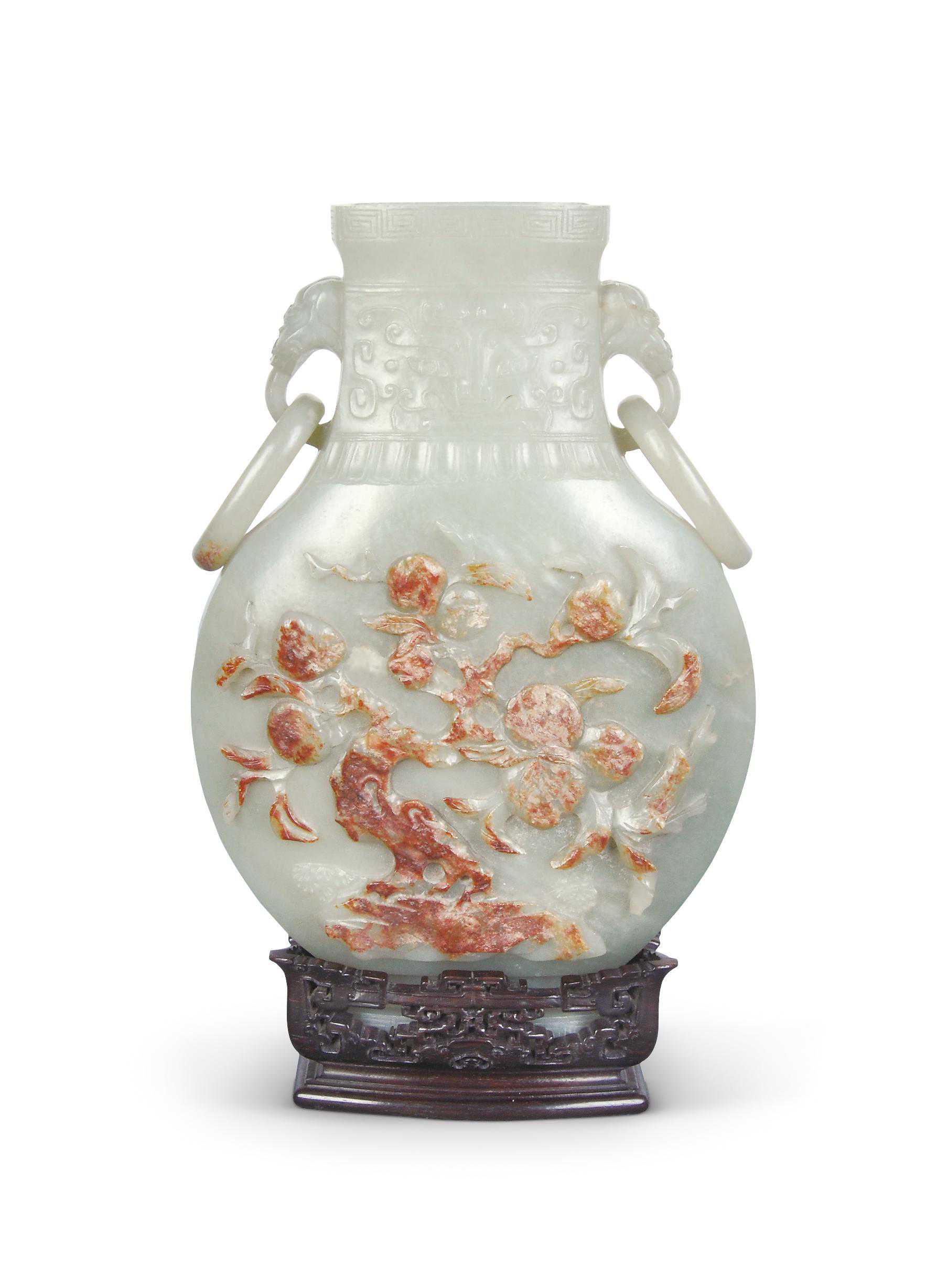 口径7.5×4.9、腹径15.5×7、足径7.6×4.5、高30.4厘米。扁瓶直口,口边饰回纹,颈部饰兽面纹和莲瓣纹。颈部左右两侧置对称兽吞式双耳,耳中套椭圆形活环。瓶身侧面中间位置亦是兽面纹。腹部正面浮雕一株带红色玉皮的桃树,桃树树干粗壮回曲,枝繁叶茂,九枚硕大饱满的桃实压坠枝头;腹部背面上方浮雕翠竹,下方则为寿石和数株水仙花。桃寓长寿,九桃寓九世之意;翠竹、寿石和水仙花皆是吉祥之物,水仙与神仙的“仙”字同字,数株水仙寓意群仙,“竹”与“祝”谐音,寿石取“寿”字,寓意“群仙祝寿”。此题材一般有两种表现形式,一是由传说中的仙人组成,八仙、寿星和西王母等;一是由各种花卉、竹、桃、灵芝、水仙和寿石等组成图案。