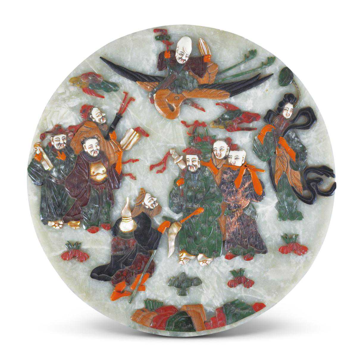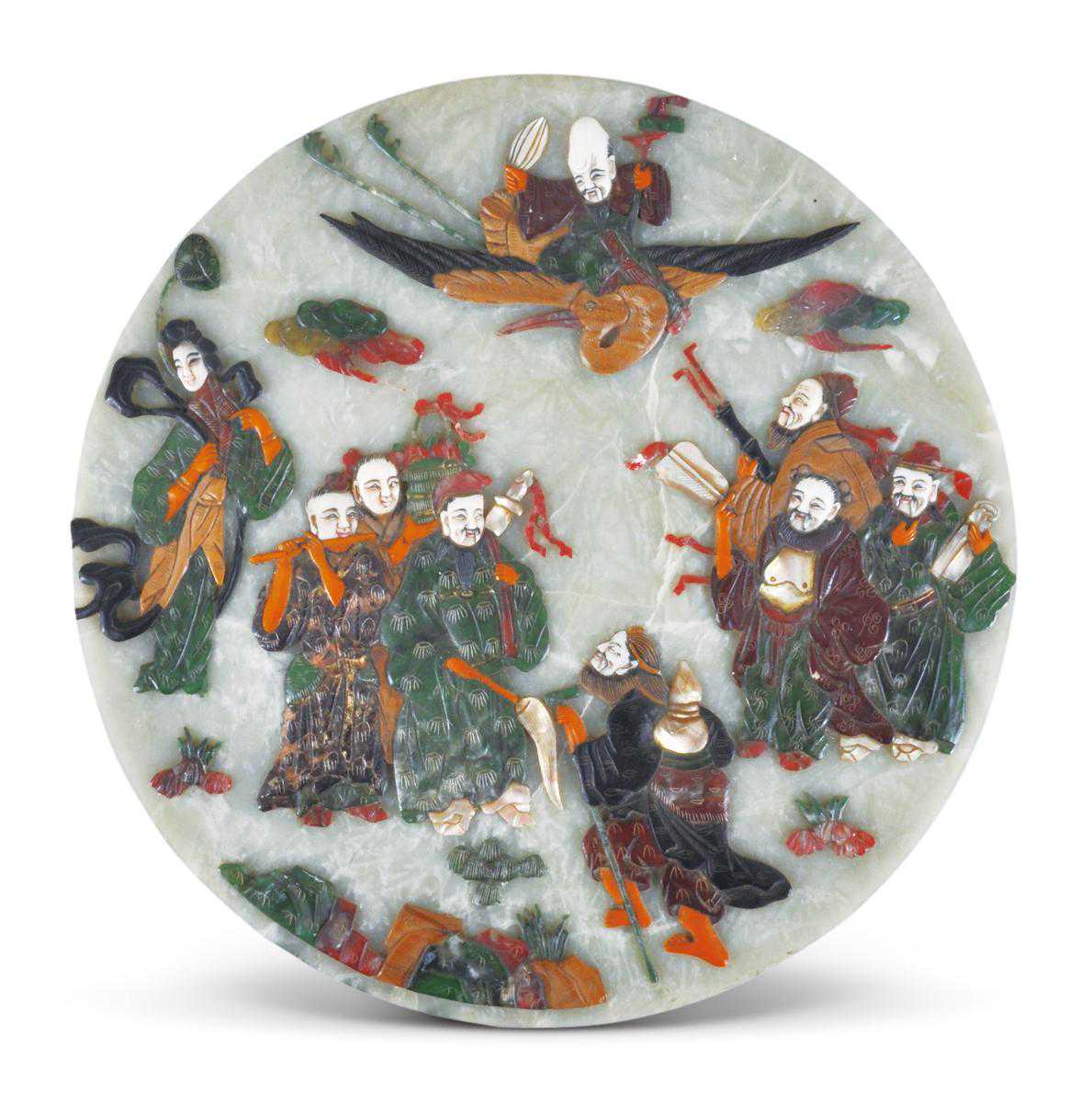 直径23、厚0.5厘米。两件屏心为一对,几乎成对称结构,犹如照镜子。屏心为正圆形,玉料为和田青玉,两件屏心出自同一块玉料。屏心正面以百宝嵌工艺来制作的,采用了玉石、贝壳、彩色石料等天然材料镶嵌而成;屏心背面为素板。屏心以八仙仰寿为题材,传说西王母寿辰之日在瑶池开蟠桃盛会宴请众神仙,众神仙前往为其祝寿。屏心整体布局合理、色彩典雅,氛围显得极为愉悦。人物神态惟妙惟肖,神情欢快,服饰飘逸,仙鹤、流云、蝙蝠、寿石为画面增添了动感和营造了高雅的仙境氛围。