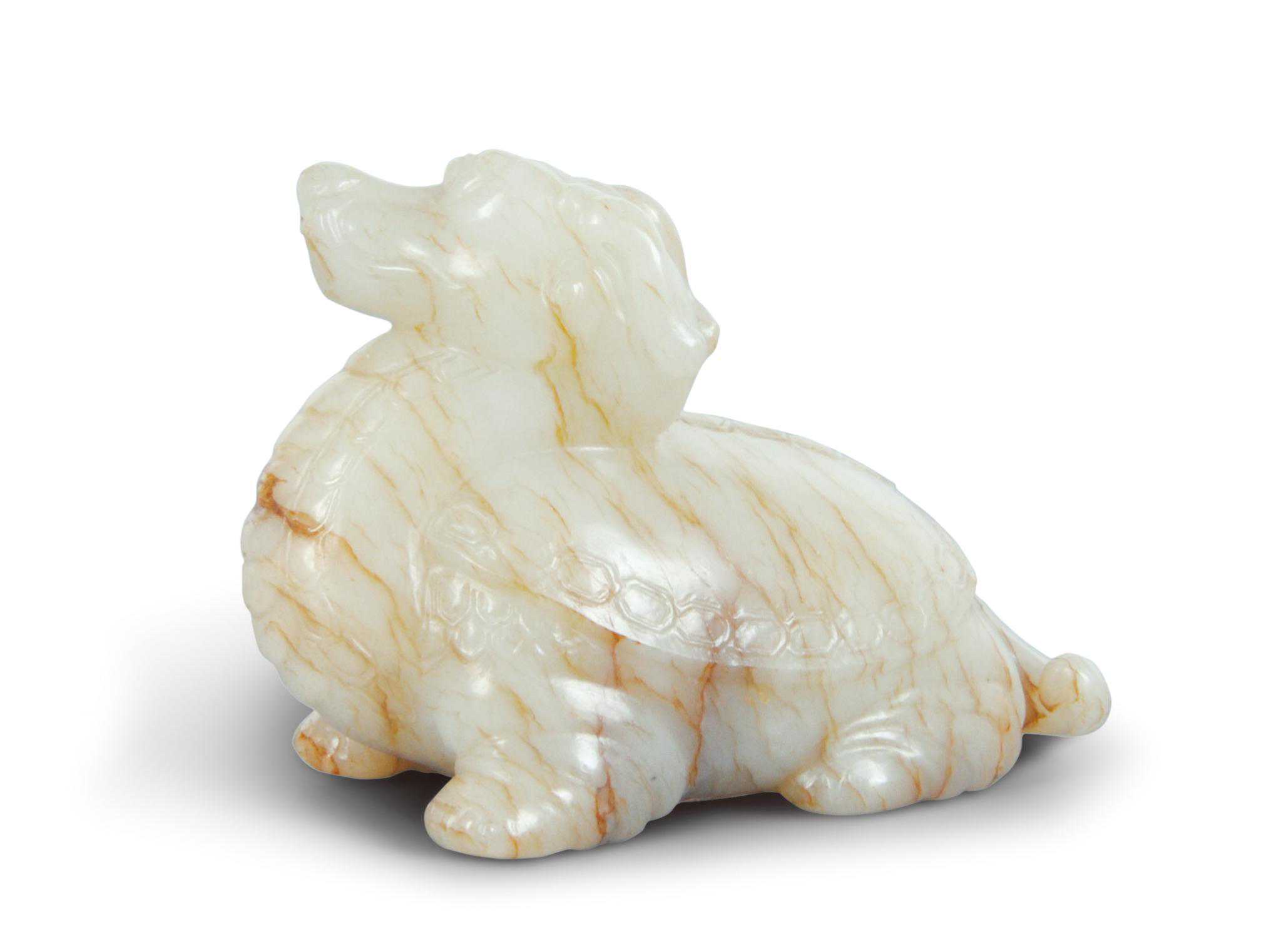 清乾隆,长7.85、宽4、高5.5厘米。和田白玉,周身有多道菊黄色及赭色的土沁纹,由此推测此玉雕应是和田古玉改作。赑屃,中国古代神话传说中的一种神兽,龙九子之一,又名龙龟,貌似龟但有齿,力大好负重,是长寿和吉祥的象征。此玉雕龙头龟身,昂首曲颈,呈蹲坐式。龙头扁方,头盖骨隆起呈瘤状,两只龙角向后方钩弯。额头亦隆起,环状龙眼,平视前方,鼻梁下陷,鼻翼微隆,成蒜头状。口扁平,张口露齿,长长的鼻须向后飘拂于耳际。蛇形龙颈,肌肉强壮。龟前肢直立支撑,后肢弯曲于身下。龟壳上刻有一周棱形肋甲,中脊线上刻有一竖排棱形背甲,脚踝处堆满肥厚凸起的褶皱,短小的龟尾,向左弯曲。玉雕下配一刻有佛教八宝吉祥图案的八棱形紫檀木座,基座底部阴刻“乾隆御赏”四字。