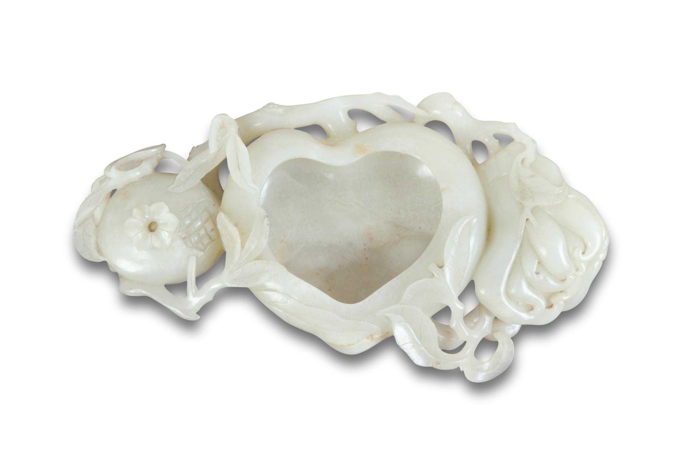 长25.9、宽12.9、高4.8厘米。笔洗由一整块青玉雕琢而成,主体为剖开的半个敛口桃子,中间挖空用来盛水洗笔,桃子的一侧为佛手另一侧为石榴,通过一小块扒掉的石榴皮,里面的石榴子粒粒可见,外饰粗壮的桃枝和桃叶。“福寿三多”典故源自于《庄子》:“尧观乎华。华封人曰:‘嘻,圣人!请祝圣人,使圣人寿。’尧曰:‘辞!’‘使圣人富!’尧曰:‘辞!’‘使圣人多男子!’尧曰:‘辞!’”后民间以佛手谐音“福”,以桃子寓意“寿”,以石榴寓“多子”,三者组合称之为“福寿三多”或“华封三祝”,寓意“多福、多寿、多子”。