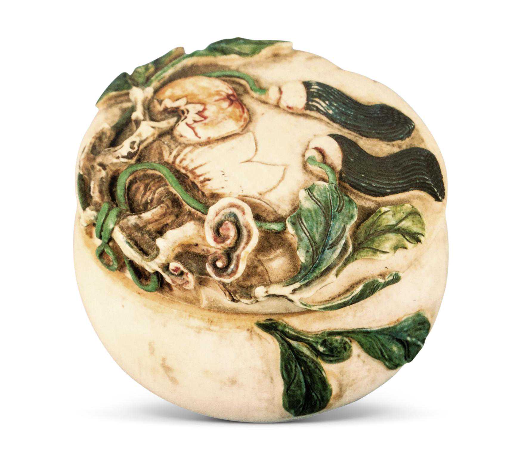 清乾隆,直径5.5、高4.5厘米。盒子呈果实状,被一剖两半成盒盖和盒身,以子母口相扣,凸雕带蒂柿子和灵芝,用如意回头穗结扎一束,寓意“事事如意、长寿吉祥”。