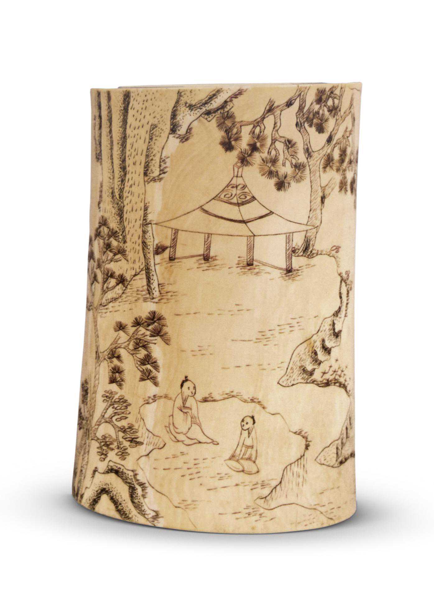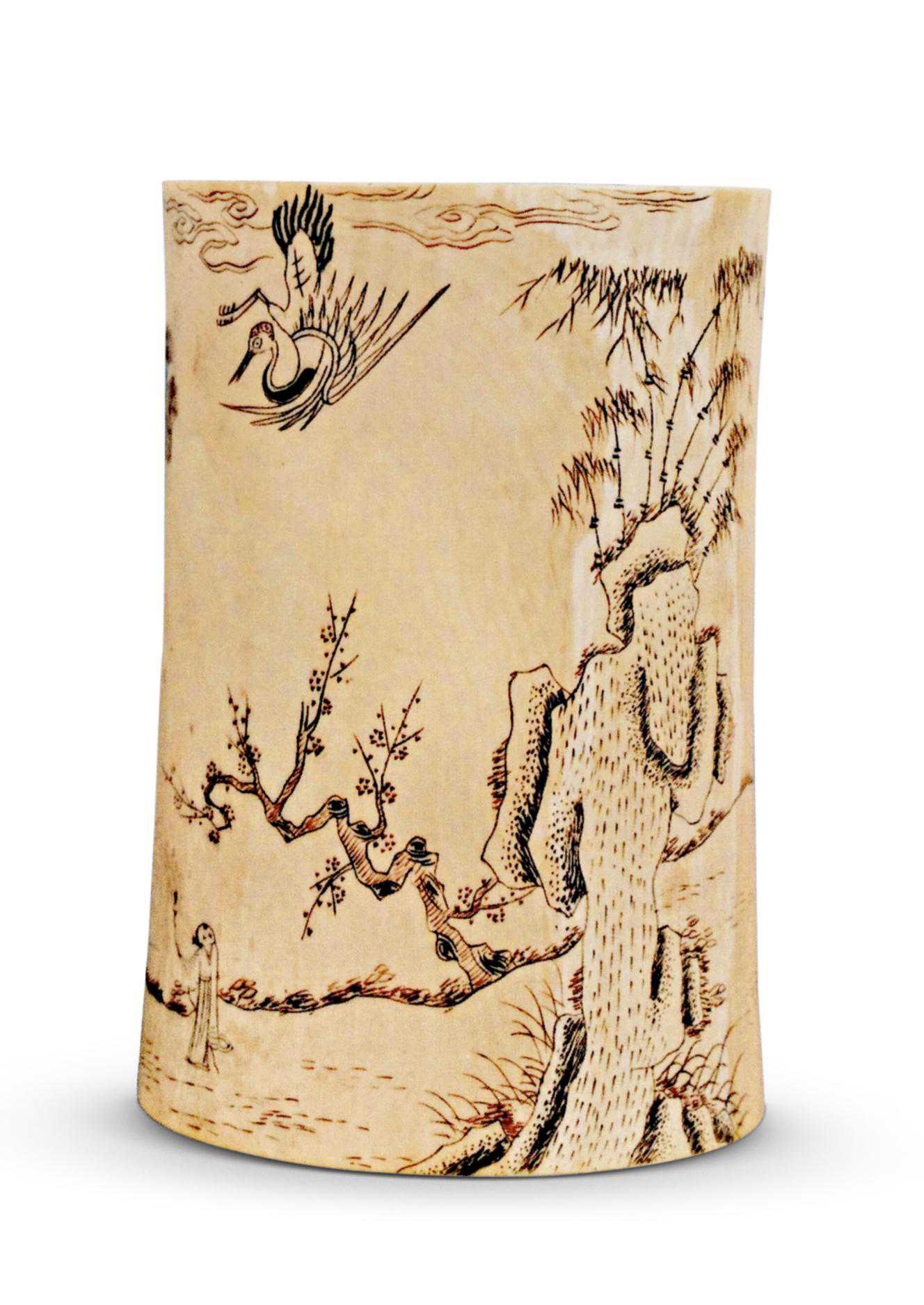 直径8.3、高12.5厘米。笔筒成直圆筒形,雕有仙鹤、松、竹、梅、兰、石,立于梅树下拄杖而立之人,坐于松树下的两人,远处凉亭,整幅图案意境深远,寓意吉祥。