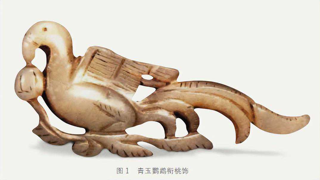 青玉鹦鹉衔桃饰(图1),长6.6、宽2.1厘米,重17克,中国故宫博物院。它以青玉质质,造型简洁,采用圆雕、透雕和阴刻技术,雕刻出一种衔着桃子的鹦鹉。