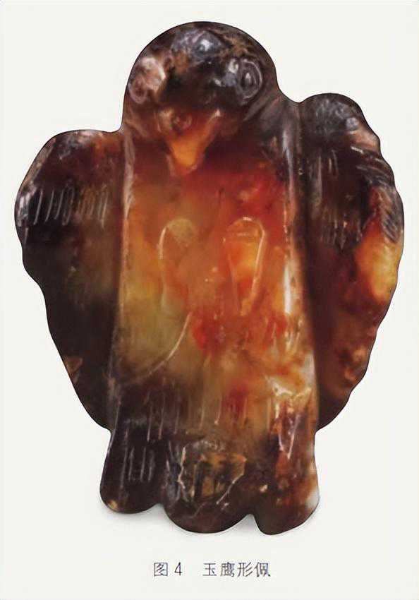玉鹰形佩(图4),杭州博物院收藏,高4.8,宽3.55cm。圆形,雄鹰休息时,双爪收拢在腹部,羽翅以阴线刻划,鸟喙上有一小孔,可供吊饰。