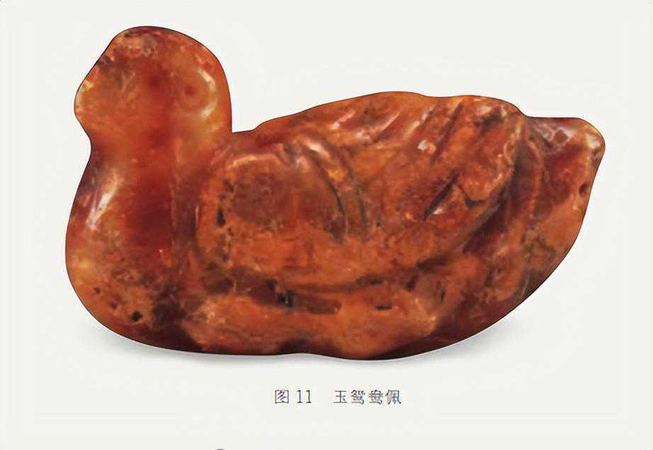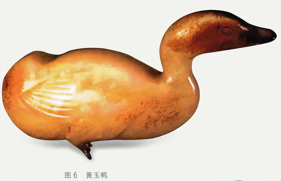 黄玉鸭(图6)高4.5、纵长8.5、宽2.8厘米,收藏于台北故宫博物馆。这是一种黄色的玉石,是新疆产的和田玉,色泽光滑,极似鸡油黄;