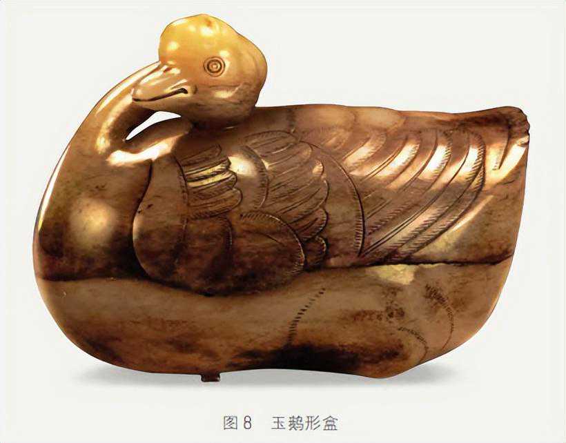 玉鹅形盒(图8),高8.4cm,宽11.8cm,灰绿色,天津博物院收藏。它们的身体是漂浮的,脖子弯曲,眼睛圆圆的。