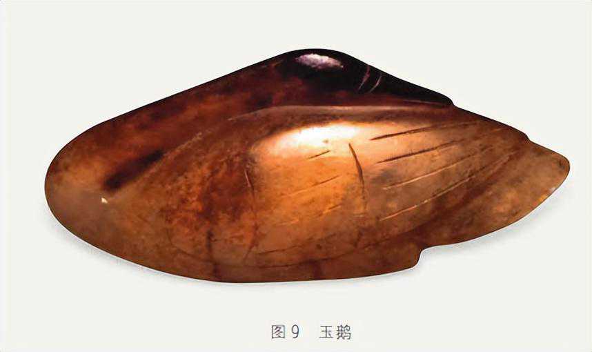 玉鹅(图9),高2、宽4.7、厚2.1厘米,现收藏于台北故宫博物馆。玉鹅是一个小小的三角形,颜色是蓝白色,尖端是暗棕色,以这个点为核心,棕色从上往下,棕色是一种非常天然的颜色。