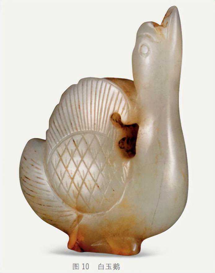 白玉鹅(图10),长2.9、高4.1厘米,重25克,收录于《中国古代玉器艺术》。白玉,圆雕。