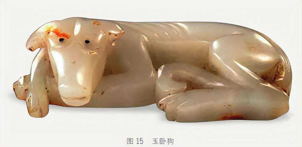 玉卧狗(图15),高1.7、长6、宽3厘米,天津博物院收藏。白中带黄。这条大狗趴在地上,长脸,圆坑眼,似镶嵌宝石脱落。