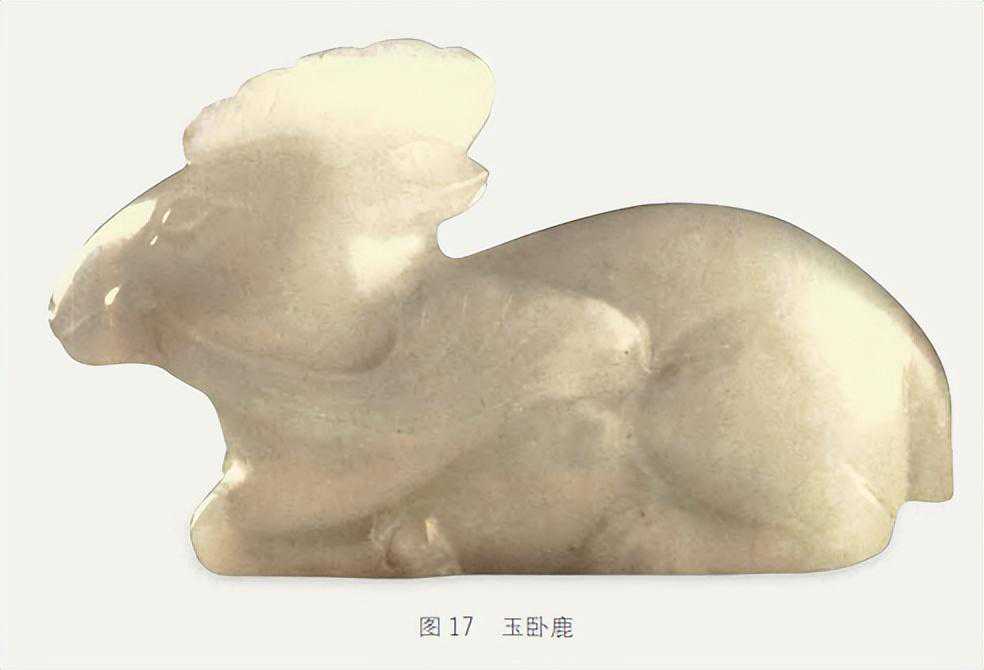 卧鹿形玉嵌饰(图16),长10.6、高6.5厘米,北京市海淀区北京师范大学工地清代黑舍里氏墓出土,首都博物馆藏。