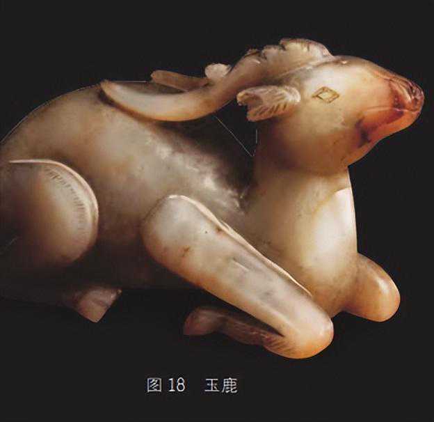 玉鹿(18),长10、宽4、高6厘米,收藏于北京故宫。玉料青白色,有些地方有花朵形状的冰缝,还有淡黄色的斑点,这是一只直立的鹿形雕像;