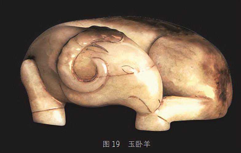 玉卧羊(图19),高4.3、长8、宽5.9厘米,武汉博物馆收藏。玉质青白色,温润晶莹,有褐色玉皮。圆雕,卧姿。