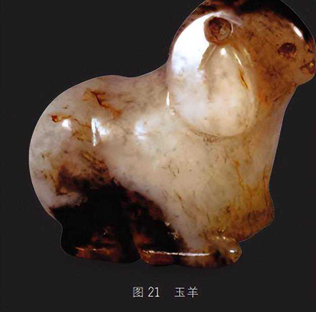 小玉羊(图20),高1.1、长1.65、宽0.95厘米,收藏于台北故宫博物馆。绿白色和黑灰色相间,部分白玉中带有褐色和黑色斑点。那是一只蜷缩着的小山羊。整块都是不能穿戴的,可以当做装饰品。