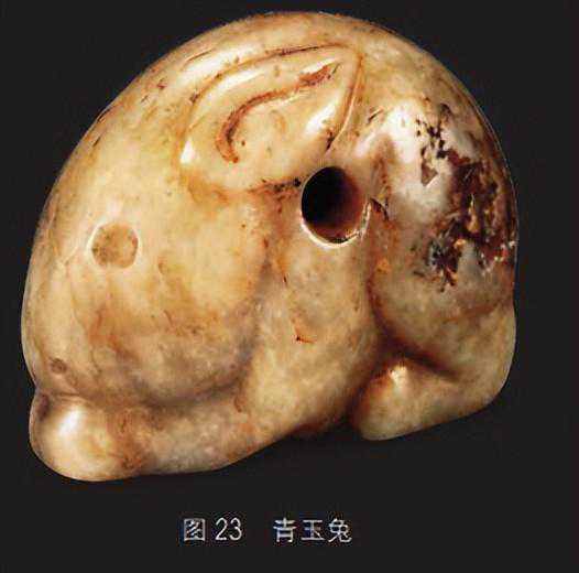 “青玉兔”(图23)收录于《中国古代玉器艺术》,长3.6厘米,高2.3厘米,重量28g。圆雕。