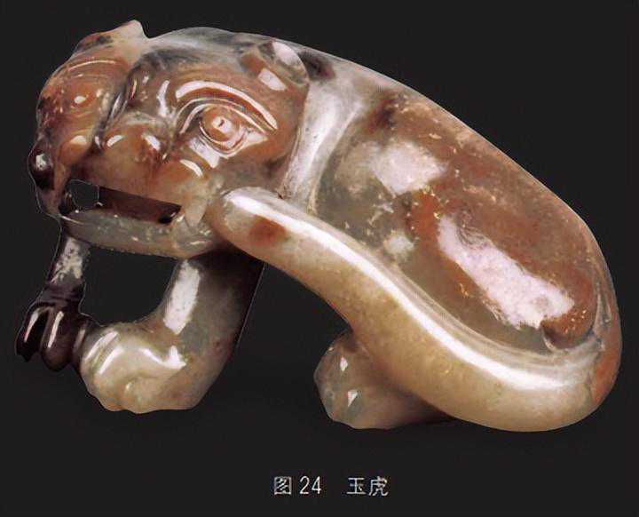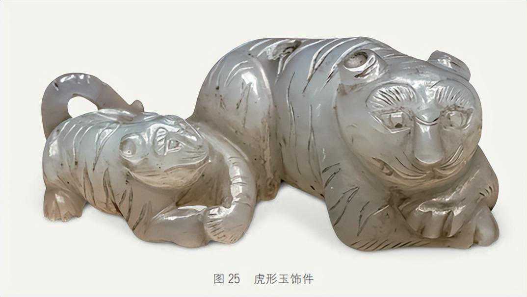 虎形玉饰件(图25),现于南京市,为南京市博物馆所收藏,宋代绍兴25年的一座古墓所发现。洁白如玉,晶莹透亮,圆雕。