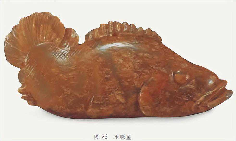 玉鳜鱼(图26),长7公分,宽3公分,现收藏于北京故宫博物馆。通体碧绿,泛着淡淡的黄光。扁平的脸型,两个圆圆的眼睛,厚厚的嘴唇向上弯起。
