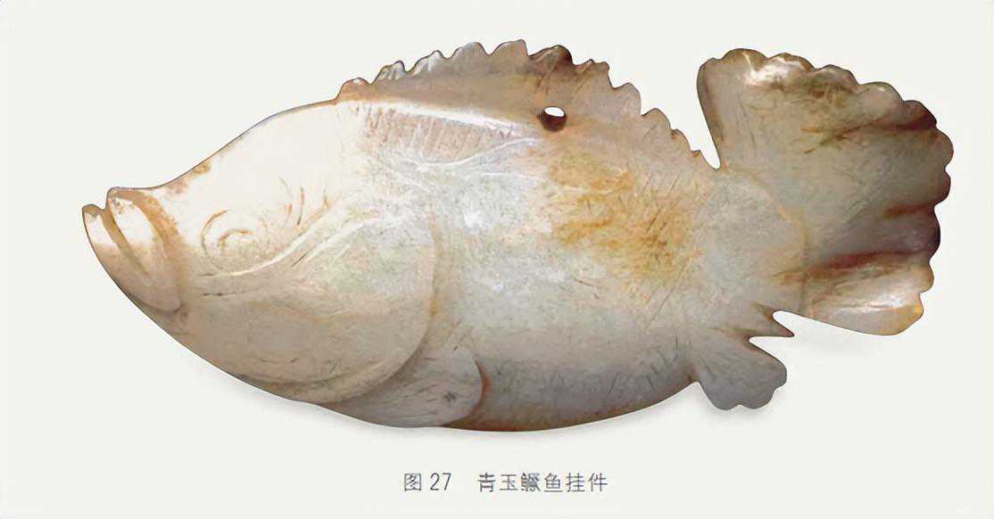 青玉鳜鱼挂件(图27),长7、高3、厚1.55厘米,杭州博物院收藏。碧绿的玉石,晶莹剔透。