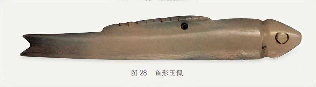 鱼形玉佩(图28),安徽省灵璧县文物局收藏,长9.18、宽1.5、厚0.25~0.26厘米。白色,部分呈淡粉色。
