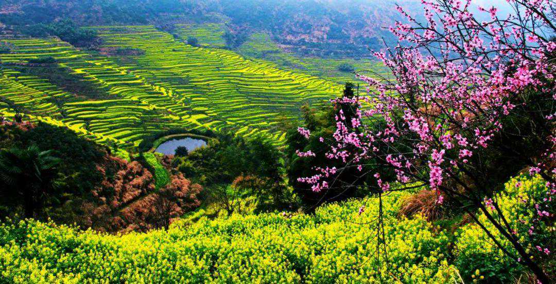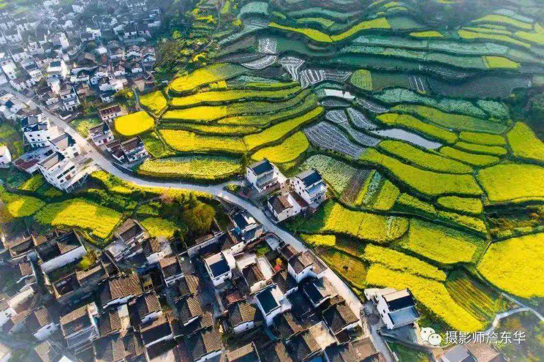 每到春季,梯田里近千亩油菜花集中开放,与桃花、梨花交相辉映,美不胜收,是婺源油菜花海一个绝世经典之作。