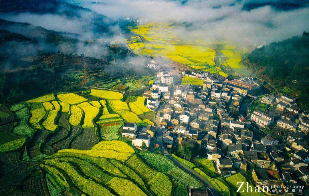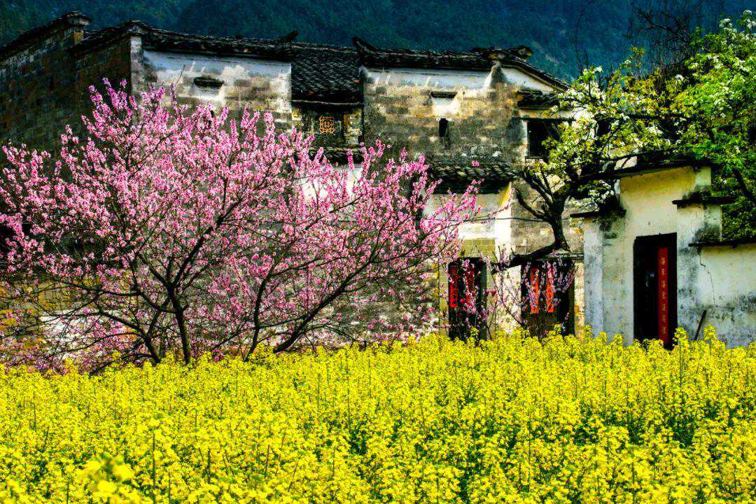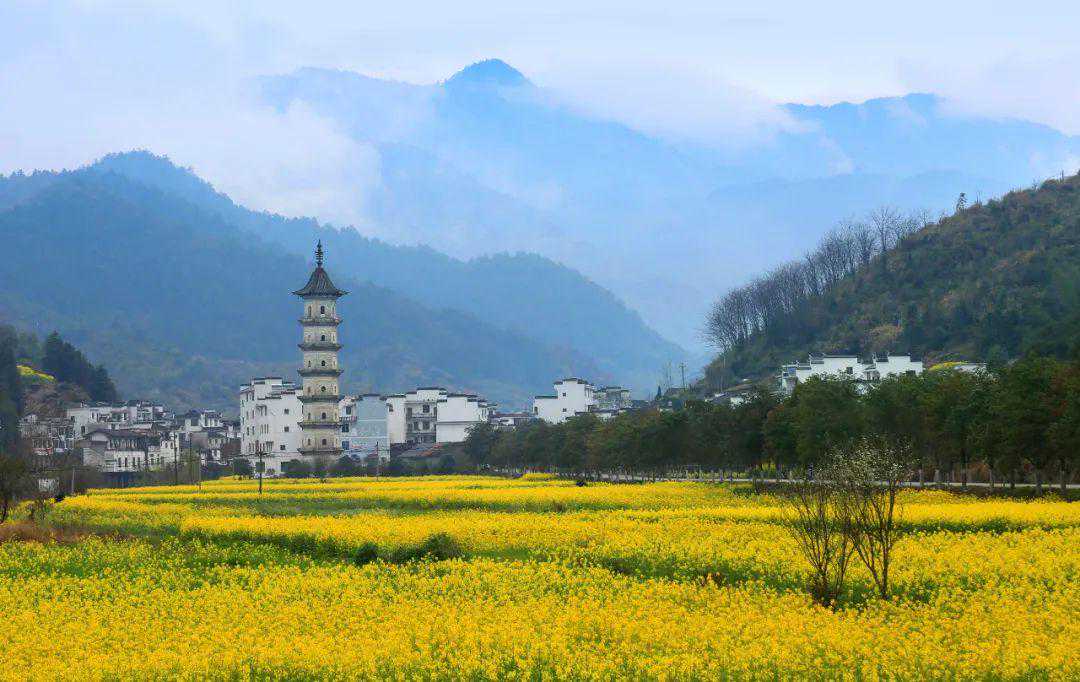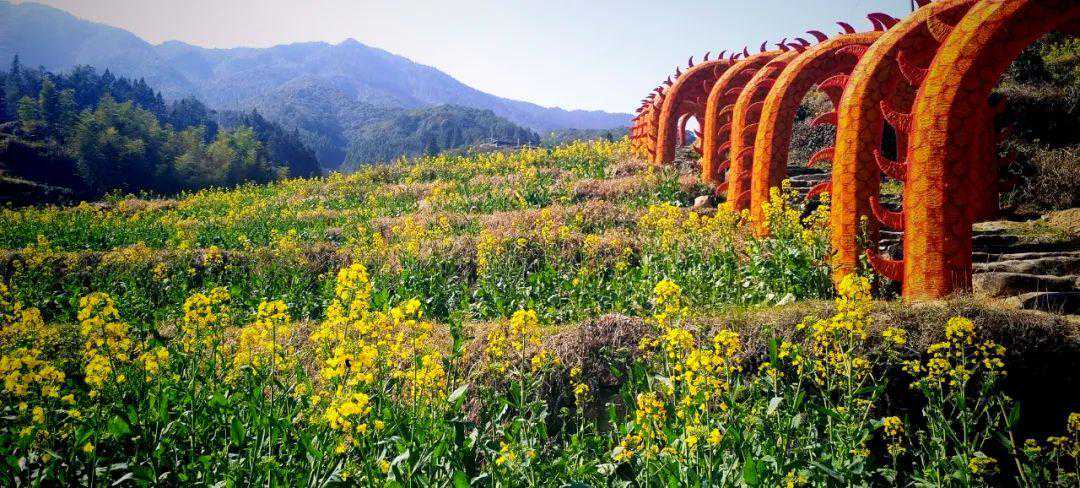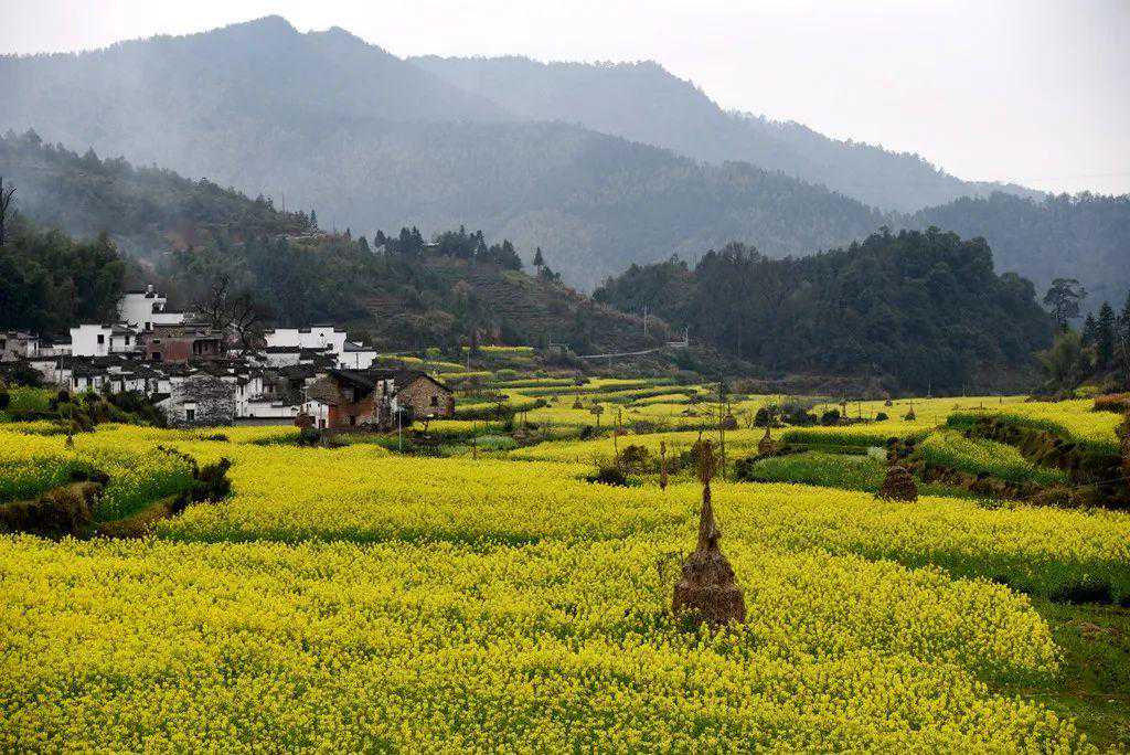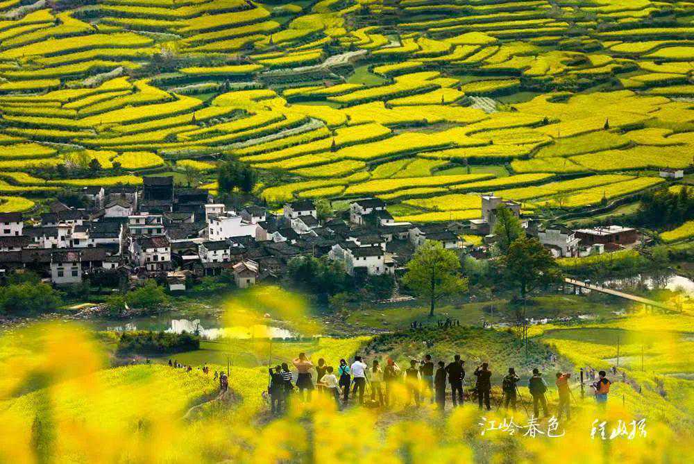 海拔千米,梯田如链似带,黄灿灿的万亩油菜花海与云海雾海、黑白色的徽式民居、洁白梨花、粉红桃花的相融合,随手一拍都是好照片。在山谷中奔泻的金黄色与耕田汉子、浣衣村姑和牧牛稚童,构成一幅幅优美的天然画卷。还有田埂上、花丛中那一座座用稻草做成的塑像,憨态可掬,趣味无穷。