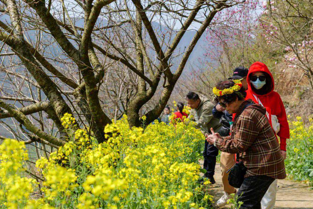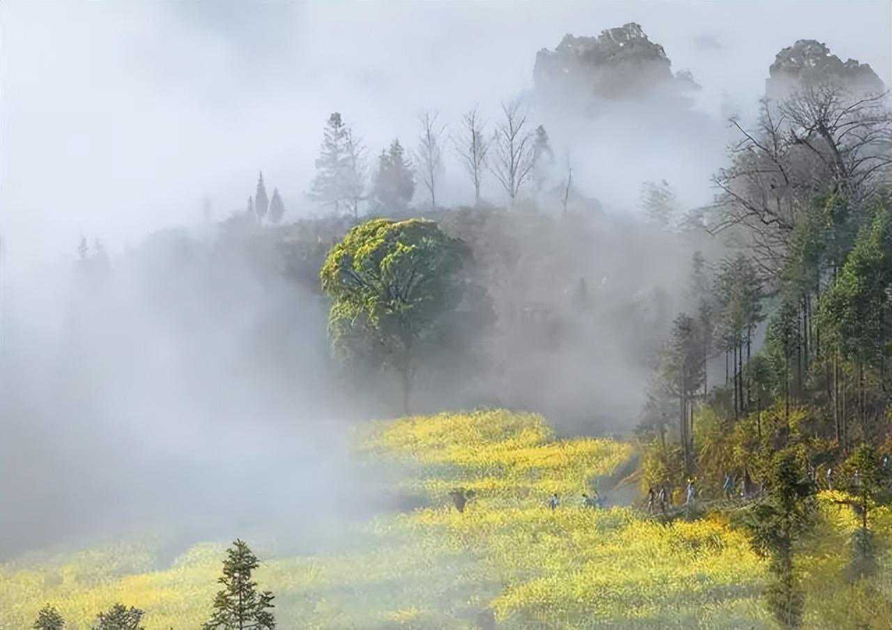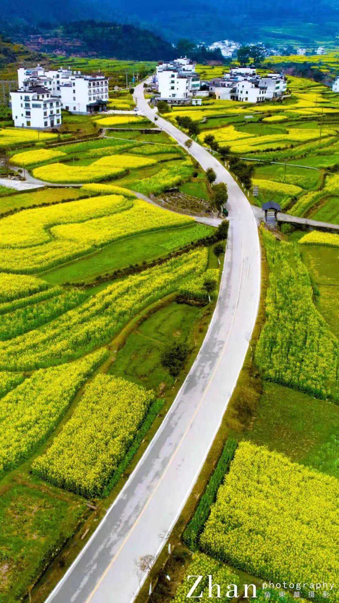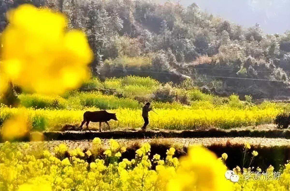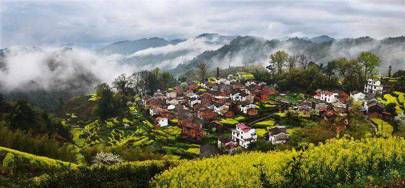海拔千米,梯田如链似带,黄灿灿的万亩油菜花海与云海雾海、黑白色的徽式民居、洁白梨花、粉红桃花的相融合,随手一拍都是好照片。在山谷中奔泻的金黄色与耕田汉子、浣衣村姑和牧牛稚童,构成一幅幅优美的天然画卷。还有田埂上、花丛中那一座座用稻草做成的塑像,憨态可掬,趣味无穷。